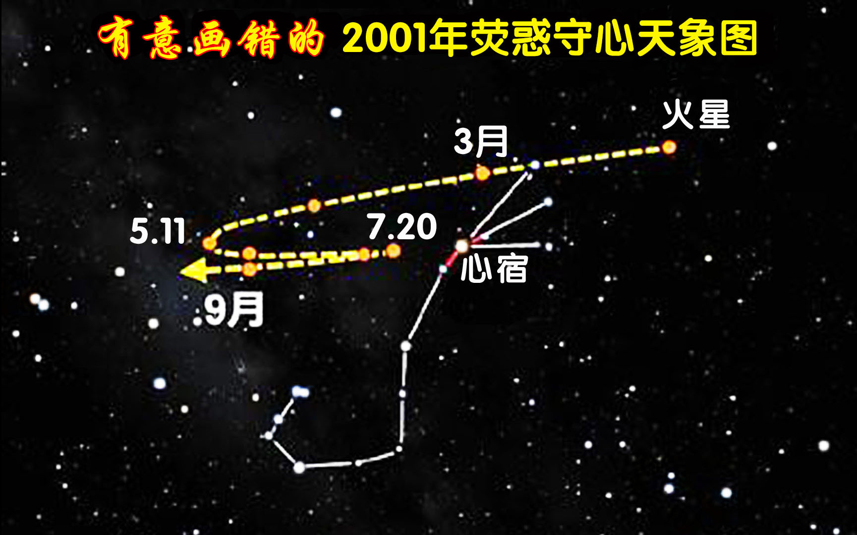 这张错画的“2001年荧惑守心”天象图,广为流传,被收录進了维基百科,俨然成了国际权威的科普知识——但是,那是故意错画,有意误导人的。