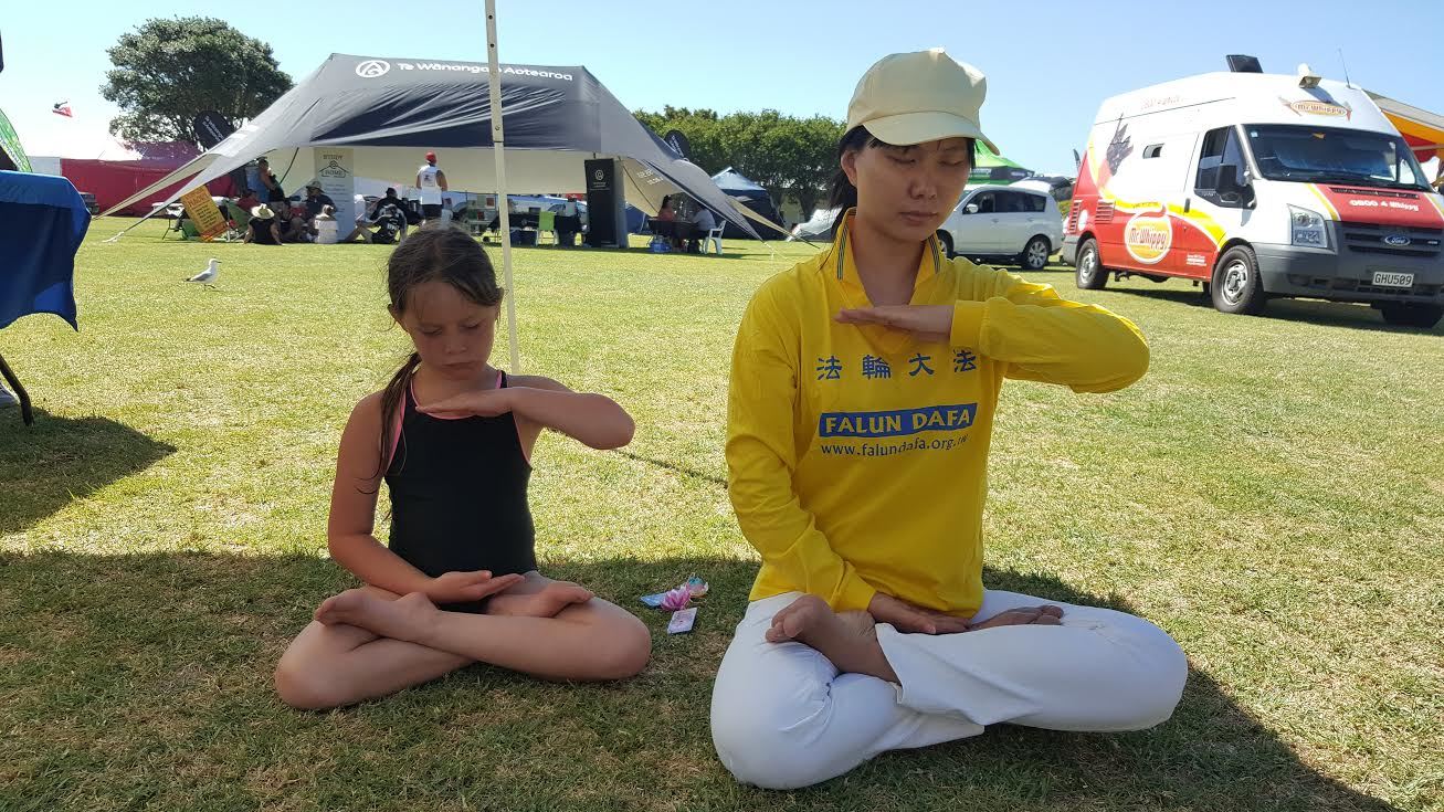 晴娜瑞(Hineari)是一名七岁的女孩,她和家人开车八个小时来参加今年的怀唐伊活动。虽然法轮功学员两天内在不同的地点,她还是能在偌大的活动场地找到法轮功学员。晴娜瑞性格文静,当法轮功学员教她炼静功,她立刻就能双盘,一个小时出定后,小姑娘说她能看到另外空间很多很美的东西。第二天她又找过来学习动功,她的爷爷也走过来看着孙女炼功,老人家非常激动,希望法轮功学员去他们住的地方的时候,能够跟小姑娘家联系上,继续教功。