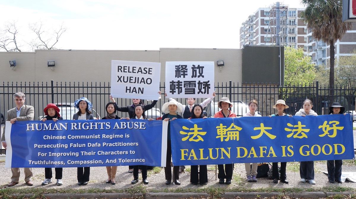山东青岛法轮功学员张红茹在今年一月刚刚被判刑三年,她居住在休士顿的女儿也来到现场声援营救韩雪娇,她说自己的母亲只因挂法轮功的真相横幅被抓捕,被非法关押半年后遭非法判刑三年。