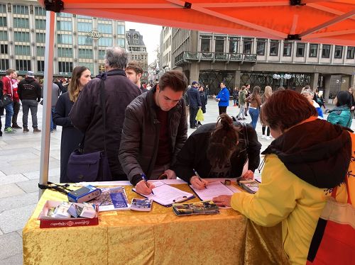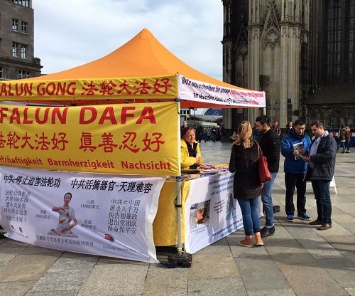 【明慧网二零一七年三月六日】德国科隆大教堂是德国最著名的几个景点之一,每天来自世界各地的游人络绎不绝。二零一七年三月四日星期六,天空晴朗,跟以前的周末一样,来自科隆附近的法轮大法学员在这里举办了法轮大法信息日。信息真相点黄色的帐篷距离科隆大教堂门口仅仅十几米的距离,几乎所有的游客包括中国人都可以看到学员们的真相景点。