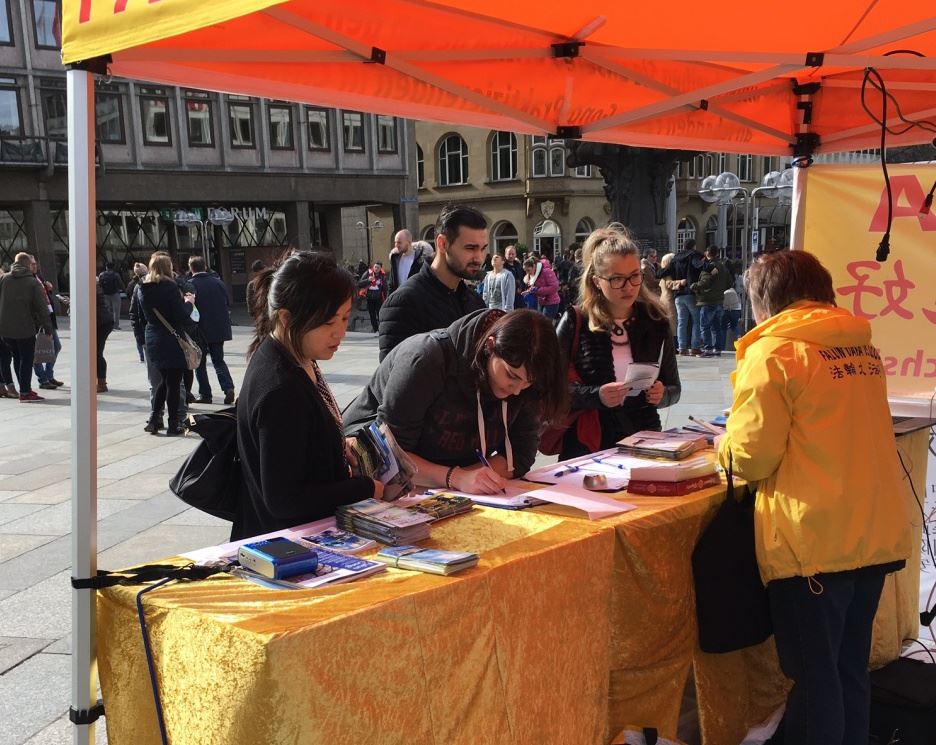 法轮功学员们除了向来自世界各地的游人介绍法轮功功法,同时也讲述在中国受非法迫害十八年,特别是发生在中国中共活摘法轮功学员人体器官的邪恶。在真相点上,各国民众了解真相后,纷纷表示支持法轮功学员。很多人说,祝你们成功;还有些人说,他们都知道共产主义很坏,以前东德的所作所为他们都很清楚,都很唾弃。有一家人签字支持反迫害,也有夫妻双双签字支持法轮功。