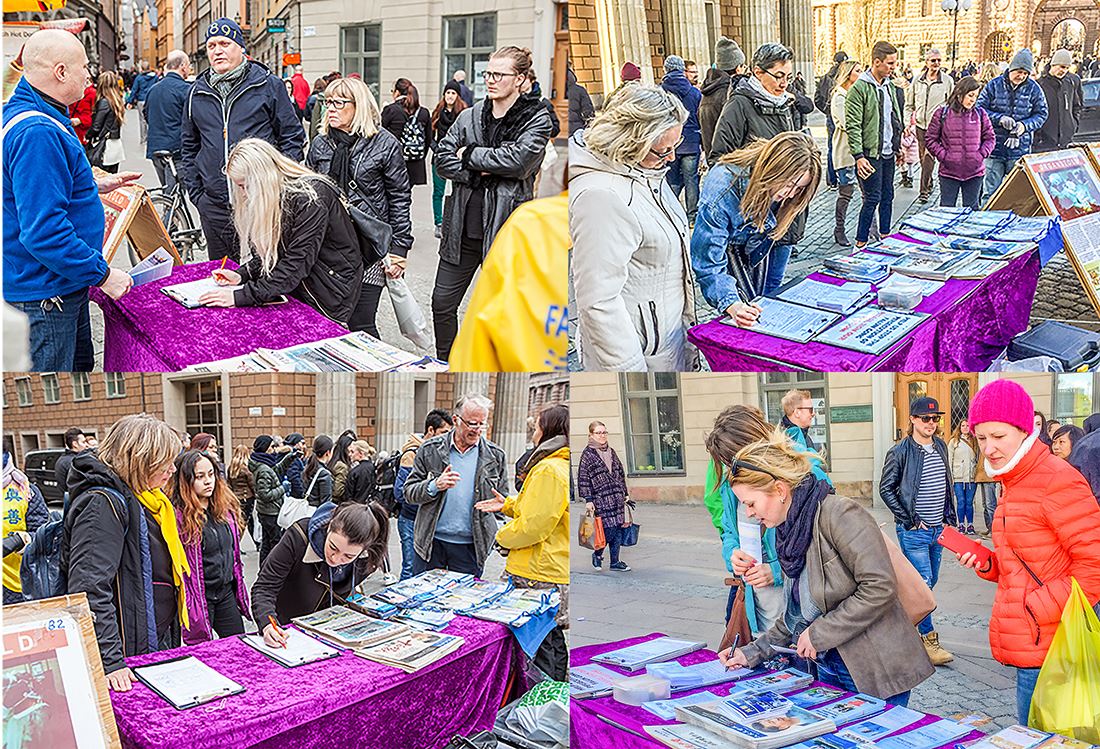当天的信息日活动有许多民众仔细阅读真相展板,有的观看学员演示功法,还有不少民众围着学员听真相,与学员交谈。了解真相后,人们纷纷在制止迫害征签表上签名。