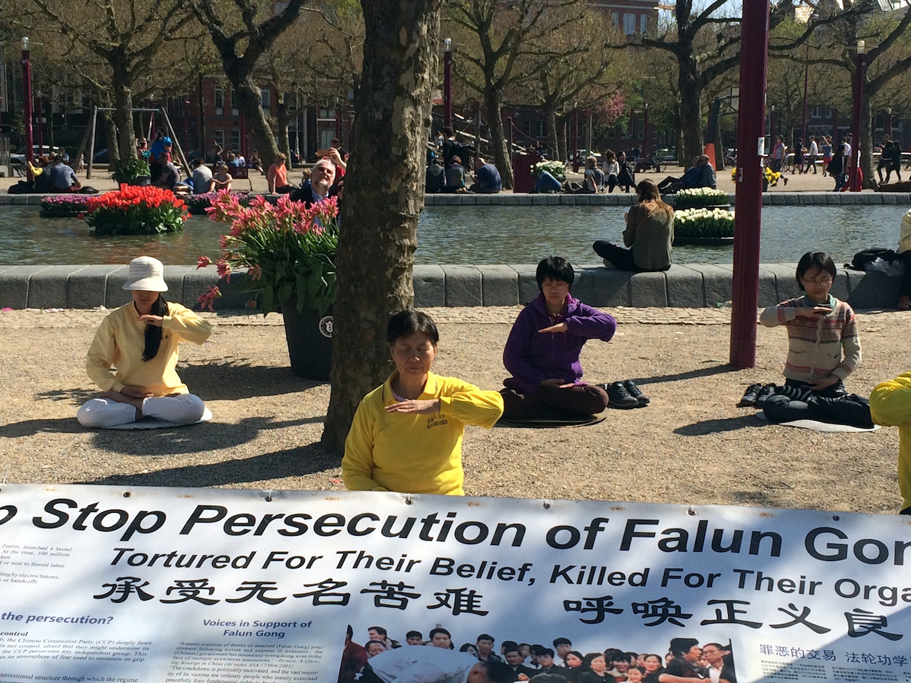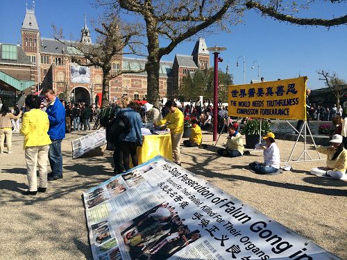 ![]() 图1-2:荷兰部分法轮功学员在博物馆前的广场上举行了弘扬法轮大法活动,图为学员们集体打坐 |