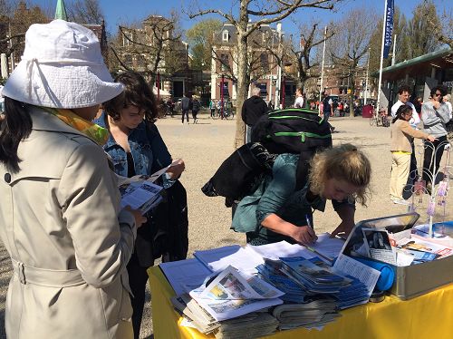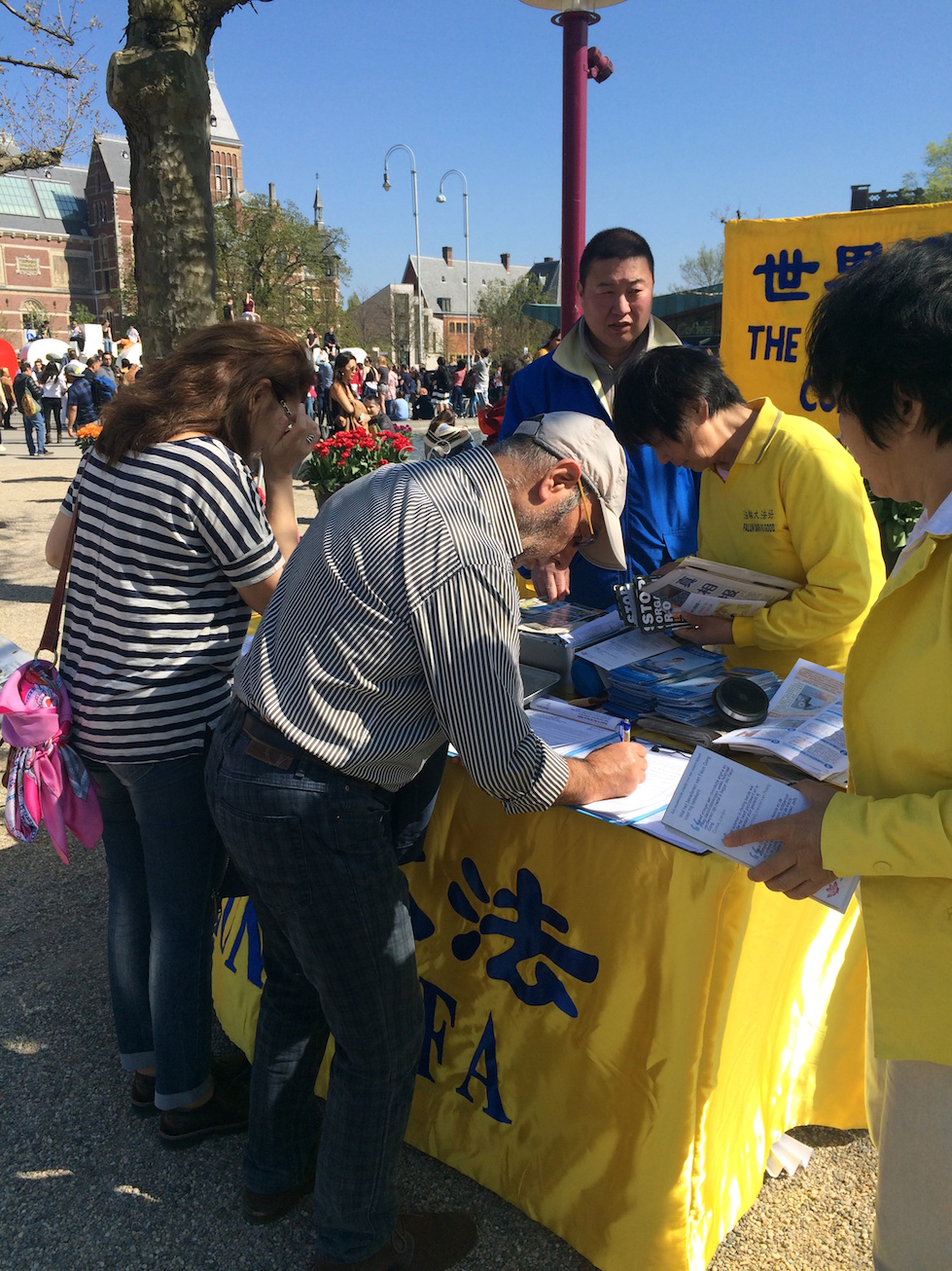 一些来自世界各国的游客在展板前驻足观看。很多游客了解了在中国发生的对法轮功修炼者的迫害事实后,纷纷在征签簿上签名,制止中国共产党活摘器官这个惨无人道的罪行。