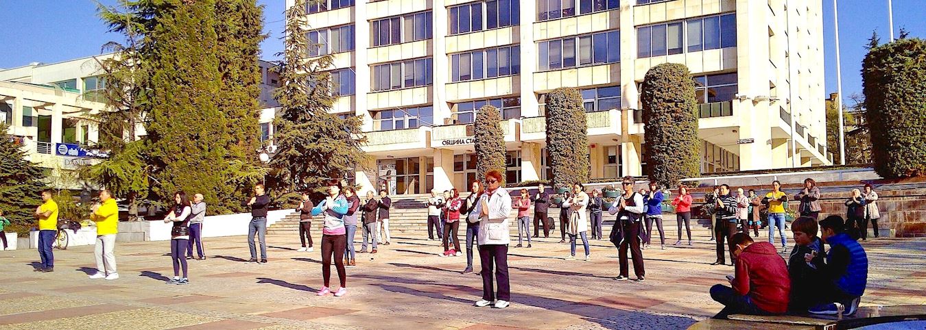 在法会的前一天,二零一七年四月一日,法轮功学员在Stara Zagora 的市中心广场弘法,向当地民众传播法轮功的真相。法轮功学员在演示功法时,不少过往行人被舒缓而优美的炼功动作吸引,不由自主地驻足观赏,并且询问这是什么功法?在哪里可以找到你们的炼功点等等,学员们一一作答,并且给他们讲述了法轮大法的美好与修炼真善忍的善良法轮功学员在中国被无辜迫害的真相;一些学员给过路的行人散发着真相传单,当学员把真相单递给执勤的警察时,有的警察接过真相单说,“我们知道法轮功,谢谢你!”