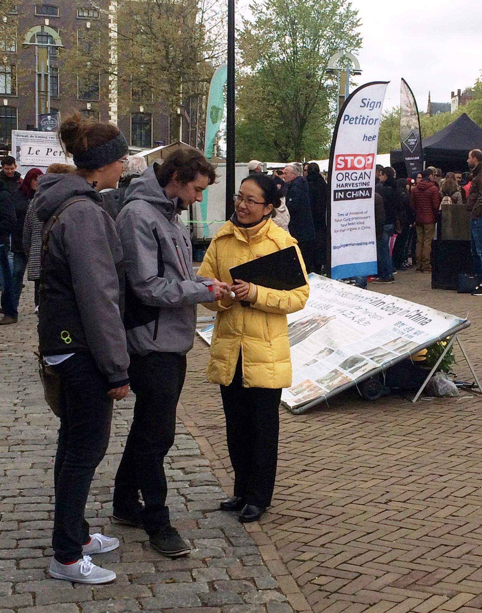 来自荷兰和其他各国的游客也在展板前驻足观看,了解真相,并纷纷在谴责中共迫害法轮功的征签簿上签名。