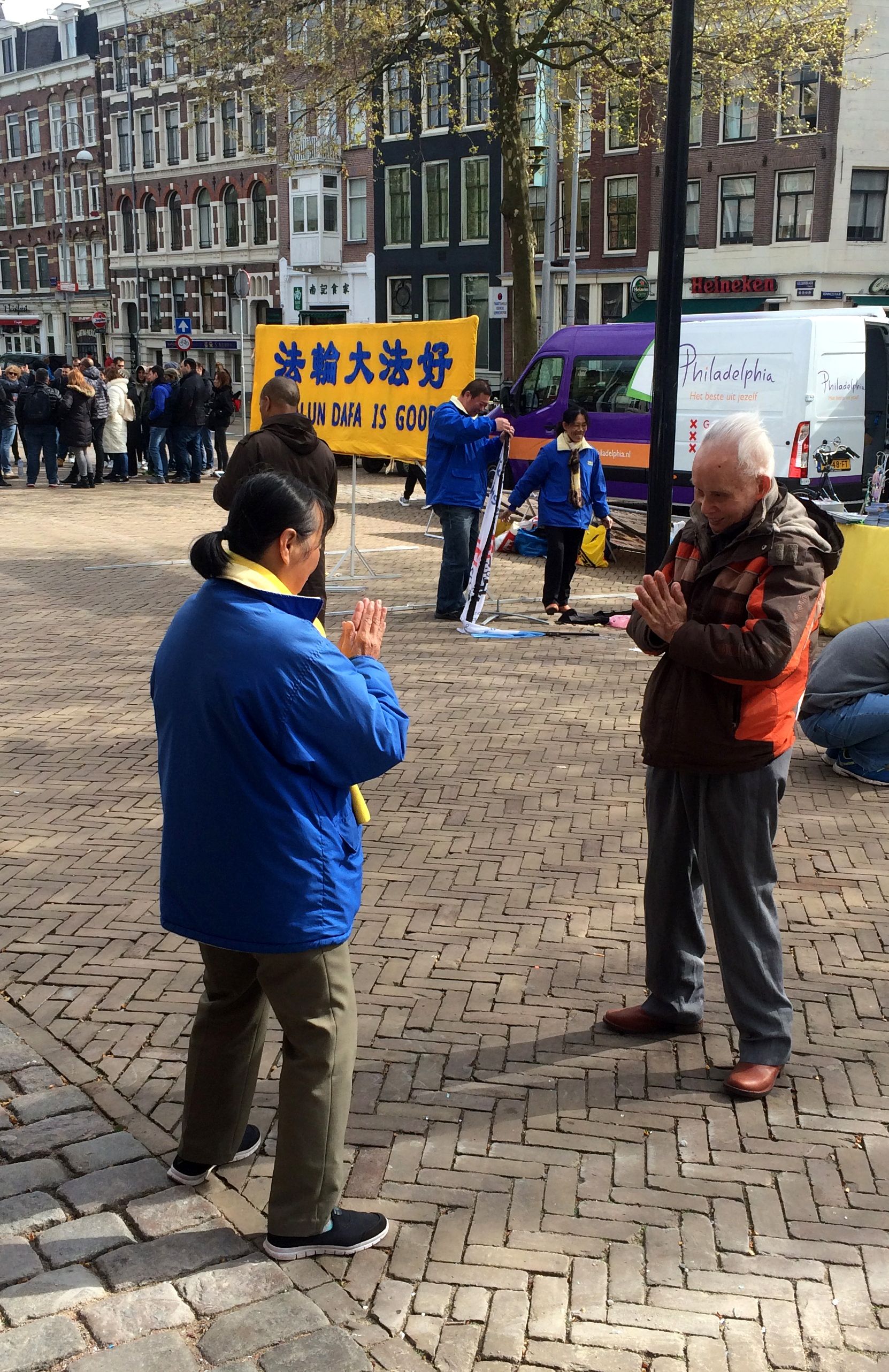 法轮功学员刚刚到达,展板还没有完全布置好,就有一位旅居荷兰的老华侨让学员教他法轮功功法,老人认认真真学习每一个动作,并且向学员询问阿姆斯特丹的炼功点,他想去炼功点炼功。