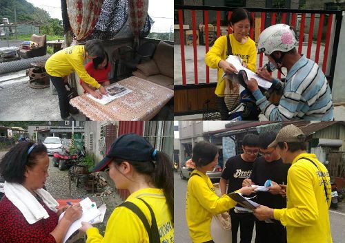 从去年十月到至今,花莲法轮功学员深入乡里洪法、讲真相,已走过了七个乡镇,目前花莲地区到四月六日已有一万二千一百一十二人签署刑事举报书,声援全球的诉江大潮,共同谴责中共暴行。