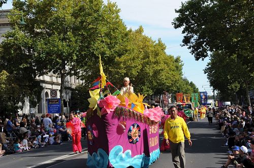 由法轮功学员们组成的天国乐团、炼功方阵、展示中国古典文化的扇舞和宫廷服饰队伍及欢快的腰鼓队,向人们展示了法轮大法的美好与中华传统文化的古风古韵。