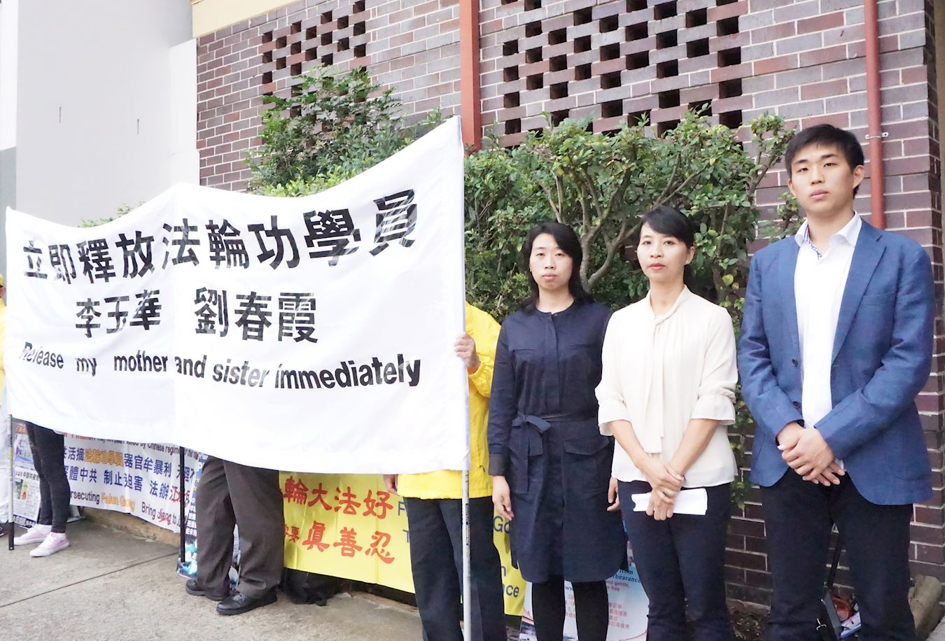 ![]() 图2:刘琳(左)和二姐刘莉(中)以及刘莉的儿子(右)要求释放被非法抓捕的母亲李玉华和大姐刘春霞 |