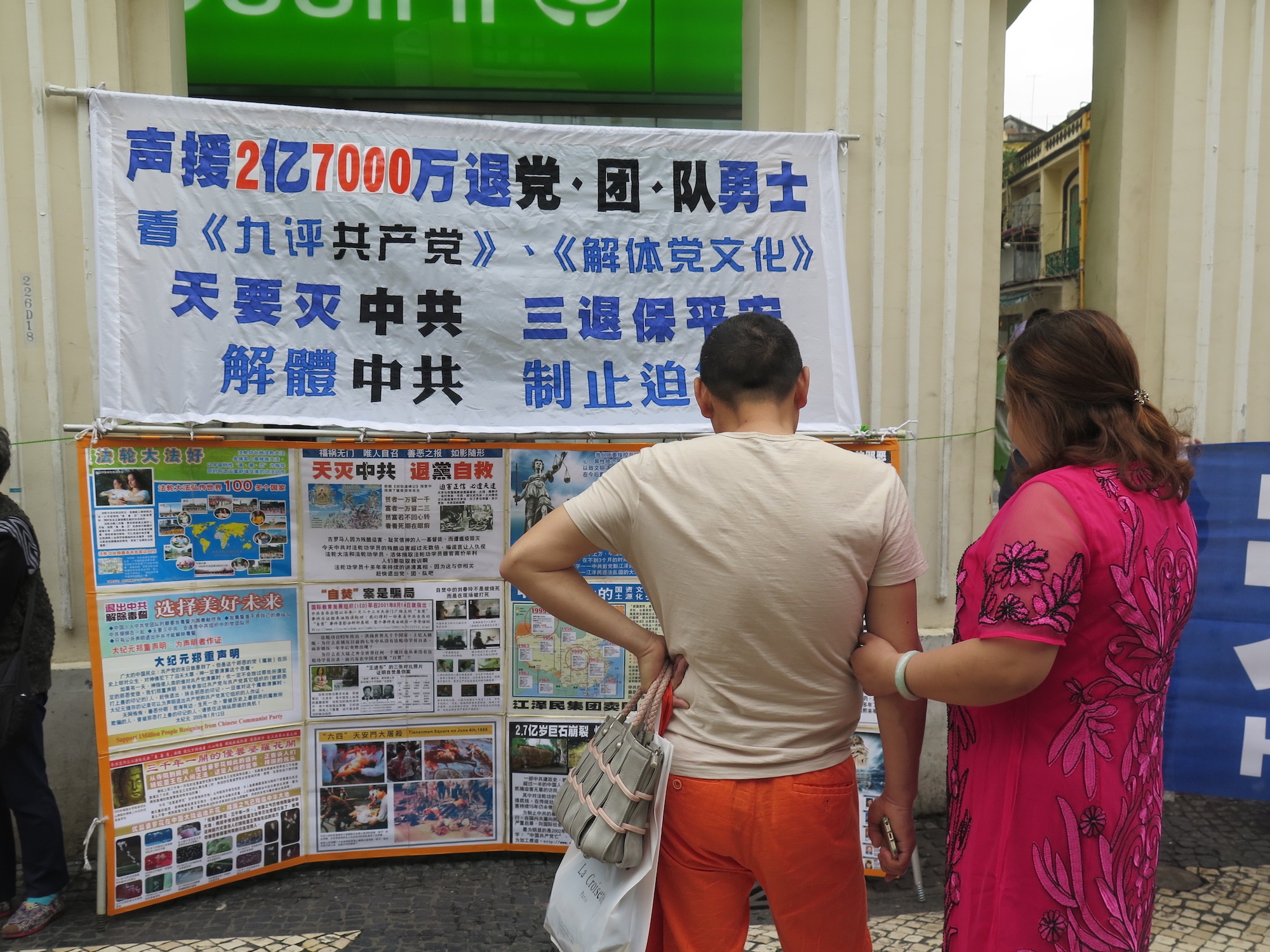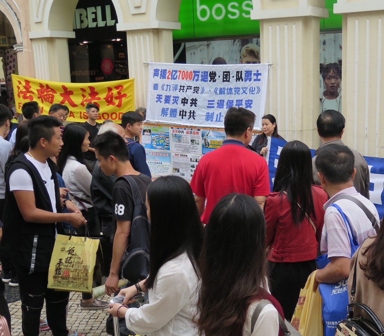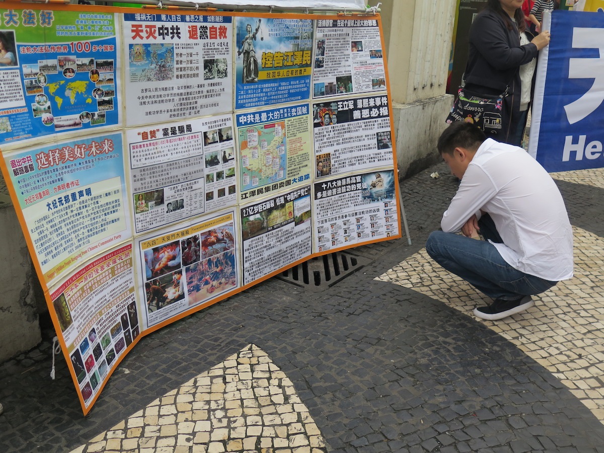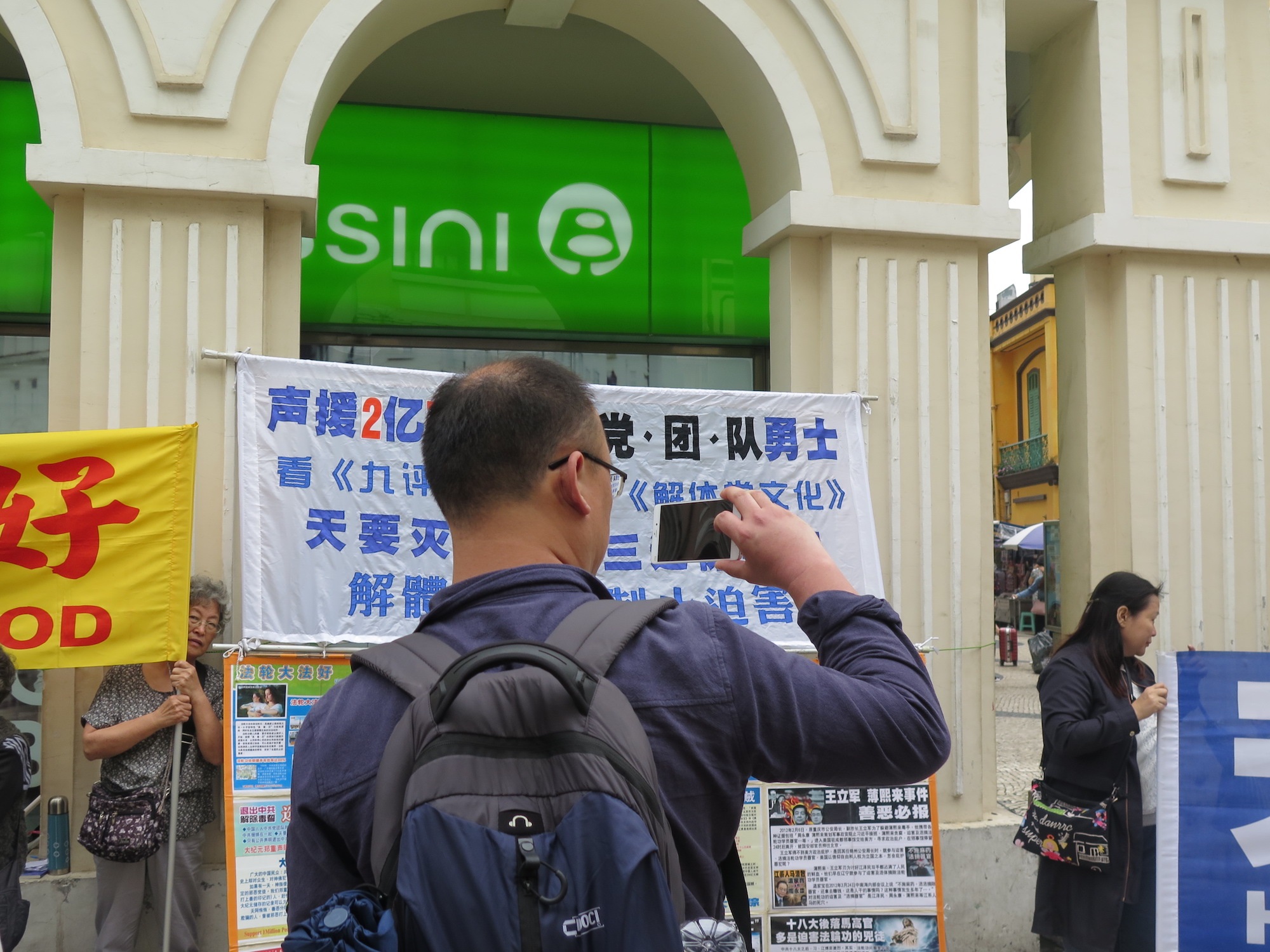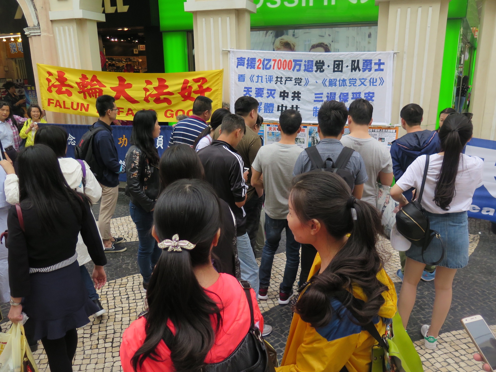 大陆游客一边看,一边和同伴说:“澳门言论自由,在大陆就看不到。”有的说:“到处都有法轮功。”有的对着横幅念:“法轮大法好!”有的游客,同伴已经走远了,他还不愿离开,一直把图片都看够了才离开。更多的游客和同伴一起看。很多游客在大陆没有看到如此震撼的场面,都拿出电话、相机拍照。