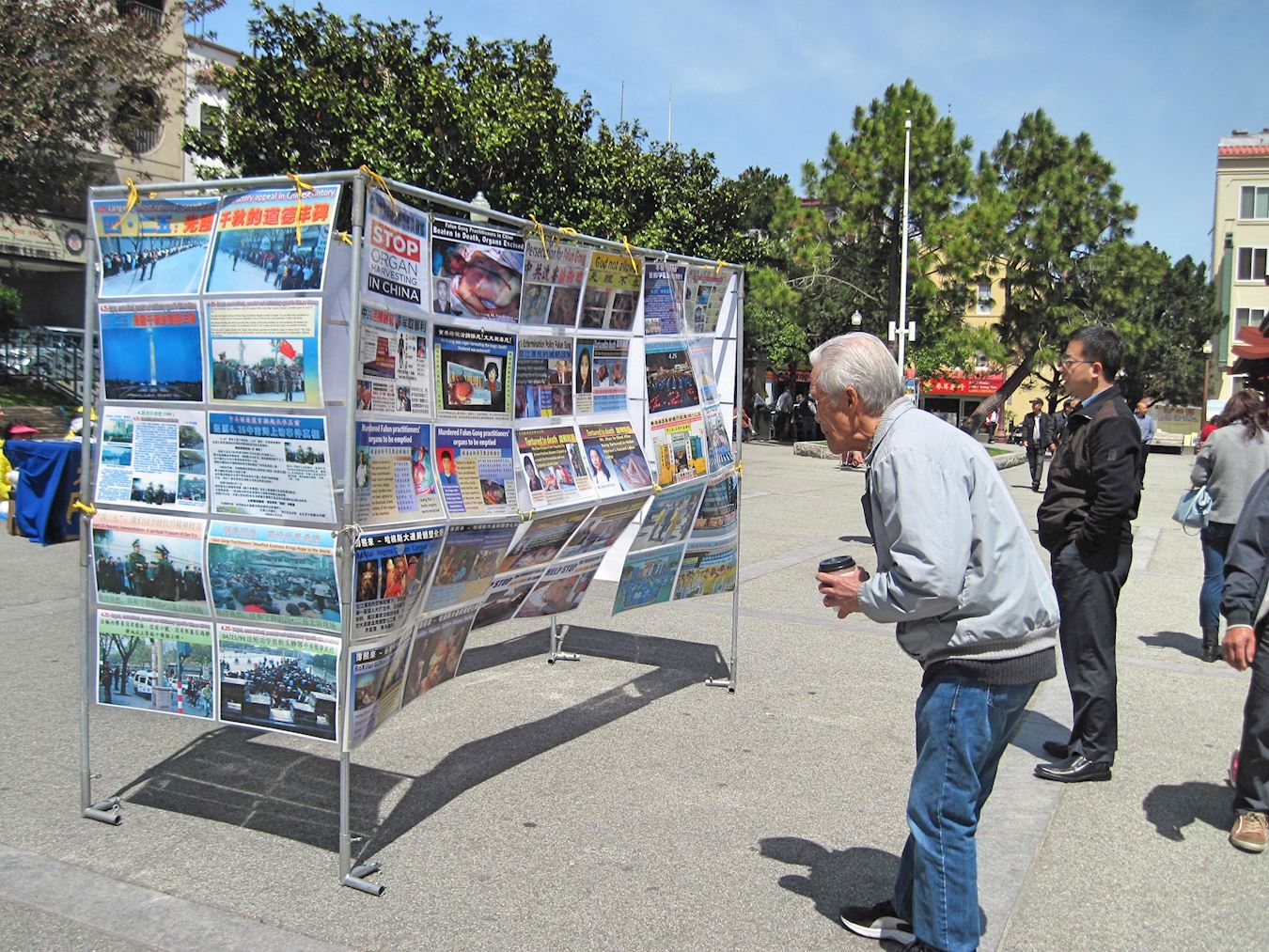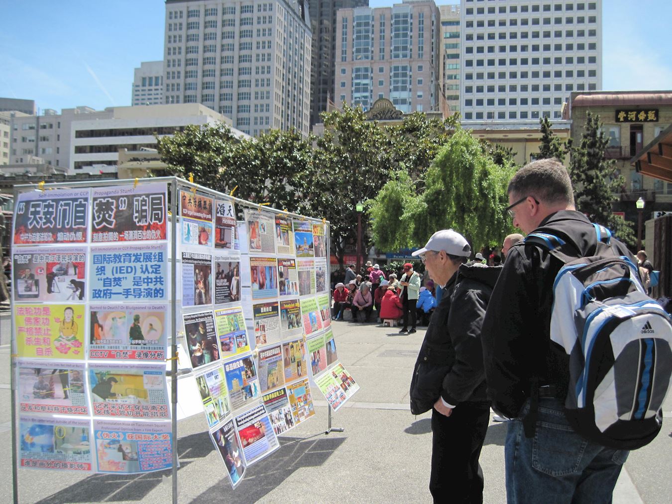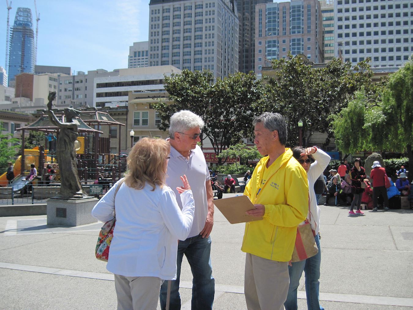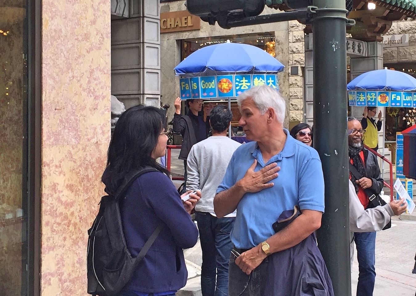 Matthew Kang来自北湾的韩国裔法轮功学员,他是于二零零二年经一位韩国朋友介绍认识法轮功的。他说,是一位韩国朋友介绍我看 各界民众:应该揭露中共的邪恶 制止迫害 Steve Bragorgos是一位退役军人,现在在联邦政府工作任部门主管,当天他是来旧金山开会经过中国城,一名法轮功学员告诉他有关法轮功在中国受迫害及活摘法轮功学员器官的讯息时表示:“我非常了解有关法轮功在中国受迫害之事,虽然第一次听说活摘器官,但是我可以想象也深信中国在共产党的执政下,其邪恶本质是会对那里的人民做出伤天害理的事。” Bragorgos先生说:“我认为要停止法轮功在中国受迫害的唯一办法就是中国共产党倒台,这样迫害才能真正的结束。遗憾的是,目前为止,无论是美国或其他国家不管是利益因素或其他原因而不愿和中国政府对立。但是,如果大家坚持的将其曝光,让所有人知道,会有结束的一天。我会告诉所有的朋友,相信他们也和我有相同的看法。” “今天,我能够感受法轮功学员在神的看护下有着强大的信念坚持自己信仰,相信有一天正义会战胜邪恶的。” 一位居住在旧金山的白人中年男子,驻足在旧金山花园角真相展板前专注的读着每张图片。他说:我常常看到法轮功学员在不同地方炼功已有几年了,非常喜欢,因为我感觉非常的祥和。刚刚在图片中看到迫害图片让我很吃惊,也让我更敬佩他们的勇敢。因为我知道在共产主义执政的政府前发声是不容易的。 汤姆来自美国东部,来旧金山开会经过花园角,从远处就感受到祥和的能量场而前来一探究竟,结果看到法轮功学员的集体炼功,还看到揭露中共迫害法轮功的真相展板。他停留在揭露中共活体摘取法轮功学员器官的真相展板前认真阅读。他说:“我是从事电脑行业的。我听说过法轮功,也听说中共对法轮功学员的迫害,我本人是天主教徒,我了解中共的邪恶本质。但不知道中共活摘法轮功学员器官倒卖,不过我相信这是事实。”汤姆并表示,他知道在“文化大革命”中,中共毁坏了中国的传统文化,并打压人民的信仰。 他感谢学员讲真相揭示给公众:“我从远处就感受到这里有神的护佑,所以走过来。我能看出你们是一群非常善良而又正义的人。我非常感谢你们将这个事实公诸于众。” Rudy来自迈阿密,是一位IT工程师,当天他是到旧金山探亲经过花园角邂逅法轮功。他之前没有听说过法轮功。当了解到法轮功以“真、善、忍”为指导原则,不但使人得到健康的身体还让人道德提升, 他说:我相信这个功法很好。并看着学员的炼功场面说:你看他们是那么的祥和(peaceful)。当得知中共迫害法轮功时他表示不解:为什么迫害这么好的功法?当了解到中共使用各种