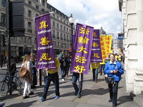 ![]() 图2~4:二零一七年四月二十二日,英国法轮功学员在伦敦市中心主要商业街道上反迫害游行 |