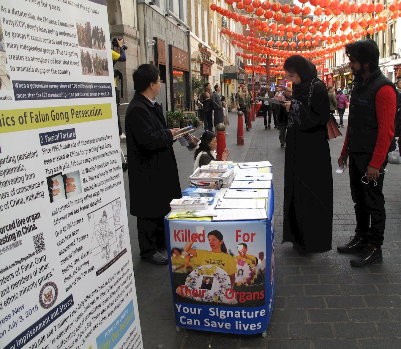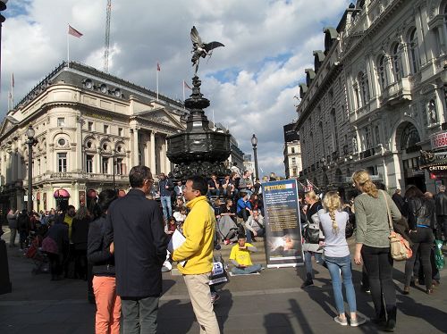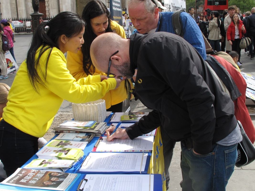 从伦敦中使馆对面,也是英国法轮功学员十五年来坚持二十四小时不间断和平抗议(24/7 vigil)的真相点的新闻发布会,到沿伦敦中心繁华商业干道以及环绕伦敦唐人街的游行,再到分布到伦敦圣马丁广场(St. Martin Place)、伦敦唐人街中心区、皮卡迪利广场(Piccadilly Circus)和大英博物馆(British Museum)四个国际旅游热点开展多种形式的弘法,法轮功学员一整天的和平理性反迫害活动把平和能量带到伦敦中心地带,让来自英国和世界各地的更多民众得以了解法轮功真相并对法轮功反迫害表达理解和支持,还有一些有缘人因而产生修炼法轮功的兴趣。广大民众感谢法轮功学员长期坚持传播真相,赞叹法轮功发放平和能量。