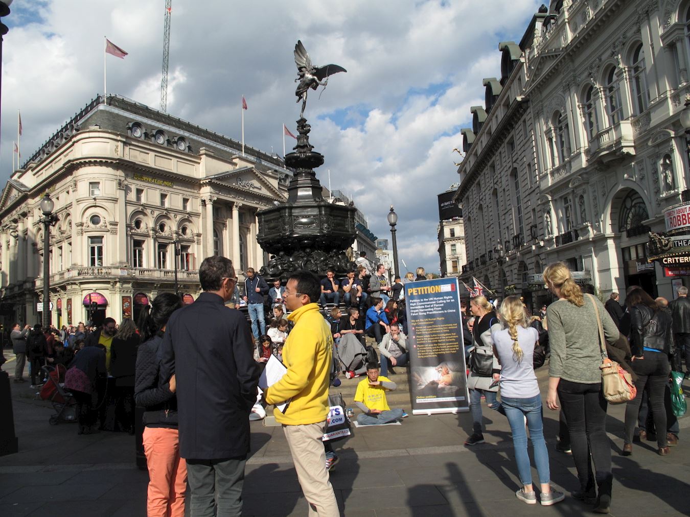 ![]() 图9~10:二零一七年四月二十二日下午至夜间十一点,英国法轮功学员在伦敦著名地标之一皮卡迪利广场(Piccadilly Circus)展示功法、讲真相、反迫害征签和烛光守夜 |