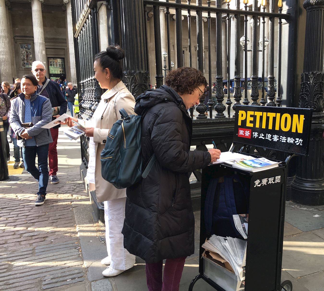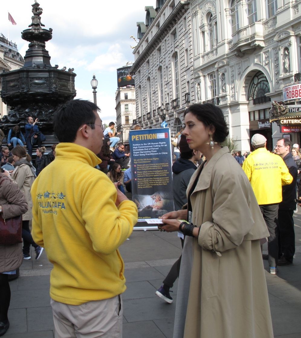 当天下午英国女士碧丽途径人潮纷繁涌动的皮卡迪利广场,她立即被反迫害反活摘征签展板所吸引并停下脚步观看,震惊中她向站在一旁发真相传单的法轮功学员询问真相。听闻中共大规模活摘法轮功学员器官贩卖牟利的反人类暴行,碧丽女士立即签名要求制止邪恶。