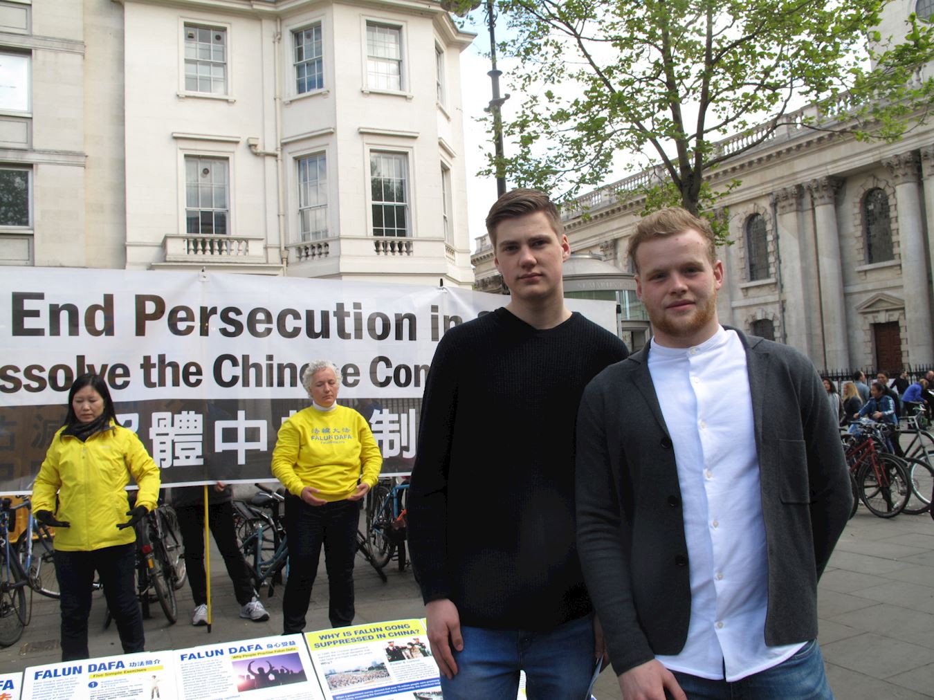 鲍德温和沃里是两位冰岛的高中学生,结伴来伦敦旅游的他们在圣马丁广场第一次听闻法轮功,站在法轮功的真相展板和炼功学员面前长时间观看、拍摄,两个小伙子非常有正义感,他们谴责中共迫害法轮功和活摘法轮功学员器官罪行,表示回冰岛后要让更多人知道这个真相,要把今天看到拍到的事实放到自己的社交媒体上,他们还对法轮功学员平和理性讲真相的做法表示赞赏,他们说到:“中共(践踏人权、反人类)的做法非常不好、非常糟糕,而且也很荒谬,我对这样的发生感到悲伤。”“继续传播真相非常重要,毫无疑问,全世界的人都该听到这个,越多的人知道越好。”“中共政权在践踏百姓的信仰自由,不允许人民有不同于它们的思想,对于侵犯人权的行为,每个人都要严肃对待,不管它在哪里发生,我们都不能漠视不管。”“(你们)坚持用和平的方式处理问题,这才是出路,就是坚持用平和的方式传递信息、引起关注。”