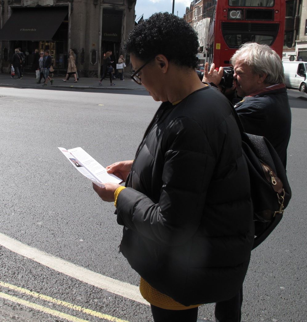 摄政大街上,在法轮功游行队伍经过后,一位在路边等车的英国女士穆娜非常专注的阅读真相传单,在伦敦一家软件公司工作的她第一次看到法轮功真相,她告诉随后经过她的法轮功学员:“我感到震惊,竟然有这样的事情在发生,这样的事情一定要让更多人知道。谢谢你们告诉我(真相)。”