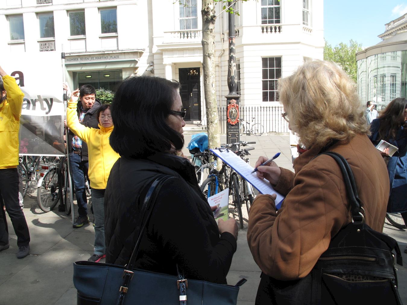 ![]() 图16:二零一七年四月二十二日,退休教师约翰逊女士在圣马丁广场被法轮功学员的平和抗议所吸引,了解真相后签名反迫害 |