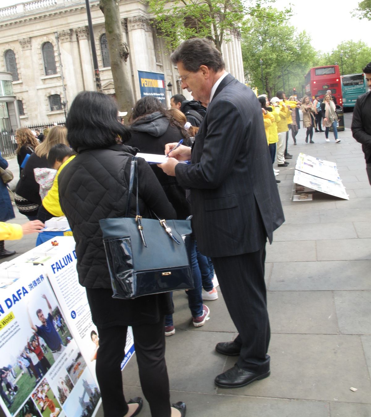 ![]() 图17:二零一七年四月二十二日,一位黎巴嫩商人在伦敦圣马丁广场第一次听闻法轮功,了解真相后签名反迫害 |