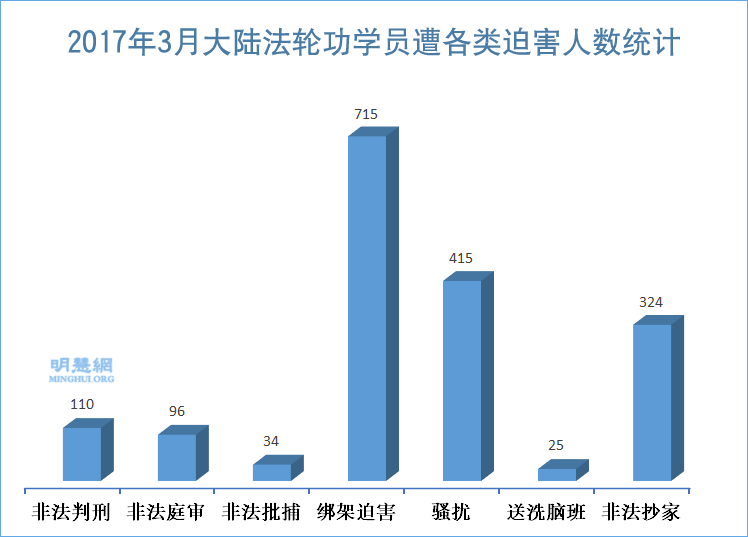 ![]() 图1:2017年3月大陆法轮功学员遭各类迫害人数统计 |