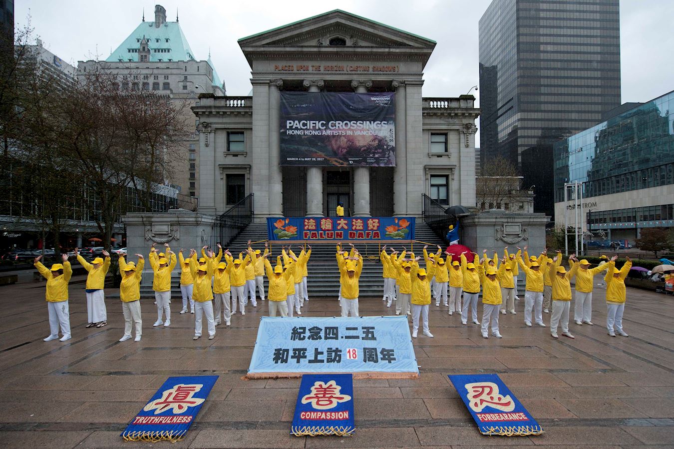 ![]() 图1~2:4月22日下午,温哥华法轮功学员在市中心艺术馆前举行大型法轮功功法演示和烛光守夜活动 |