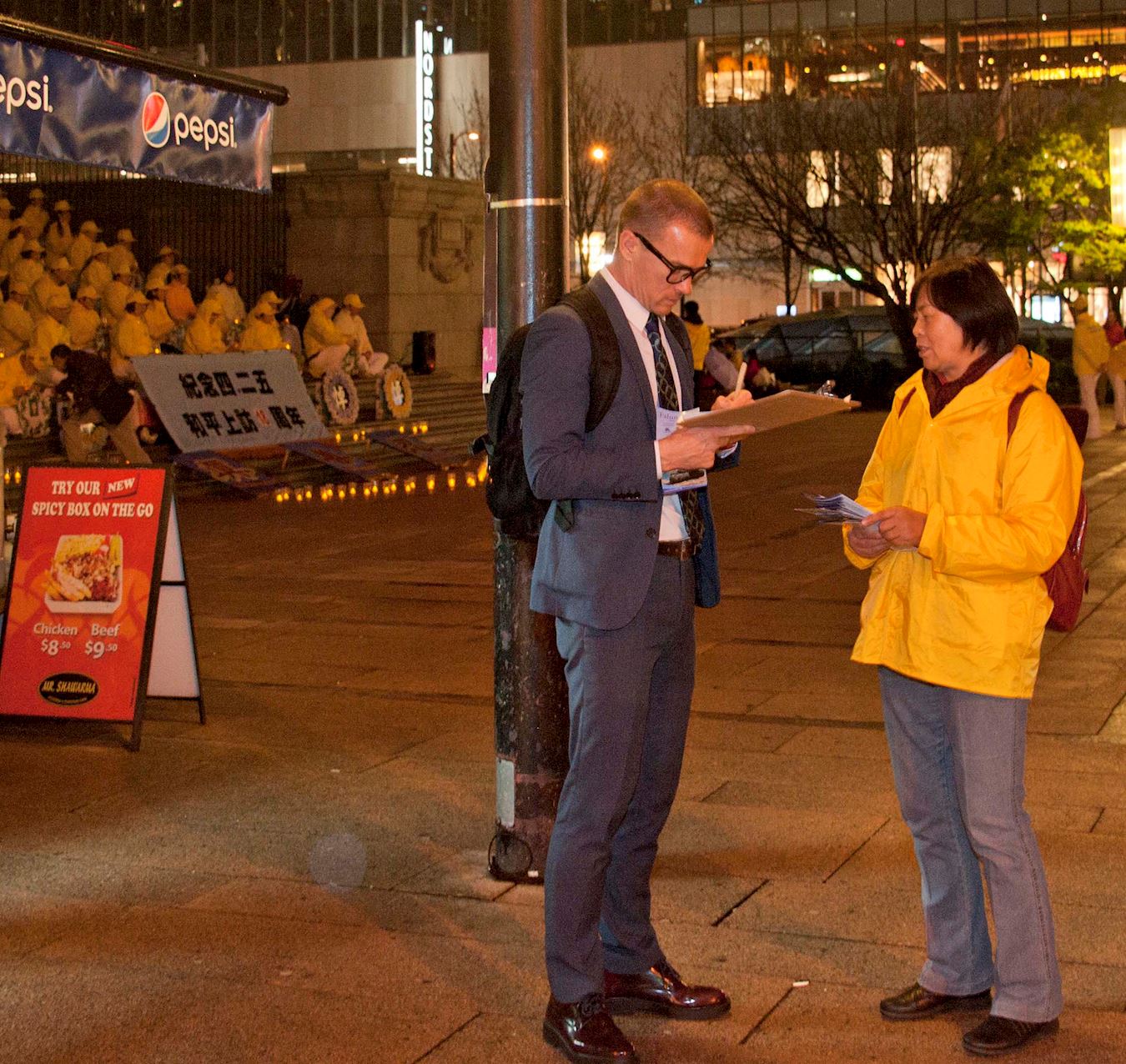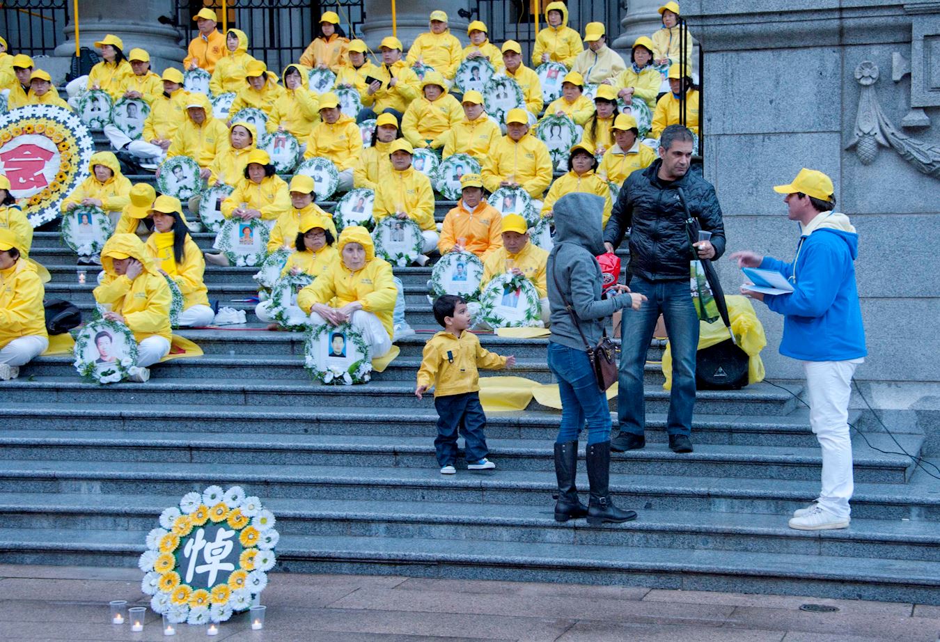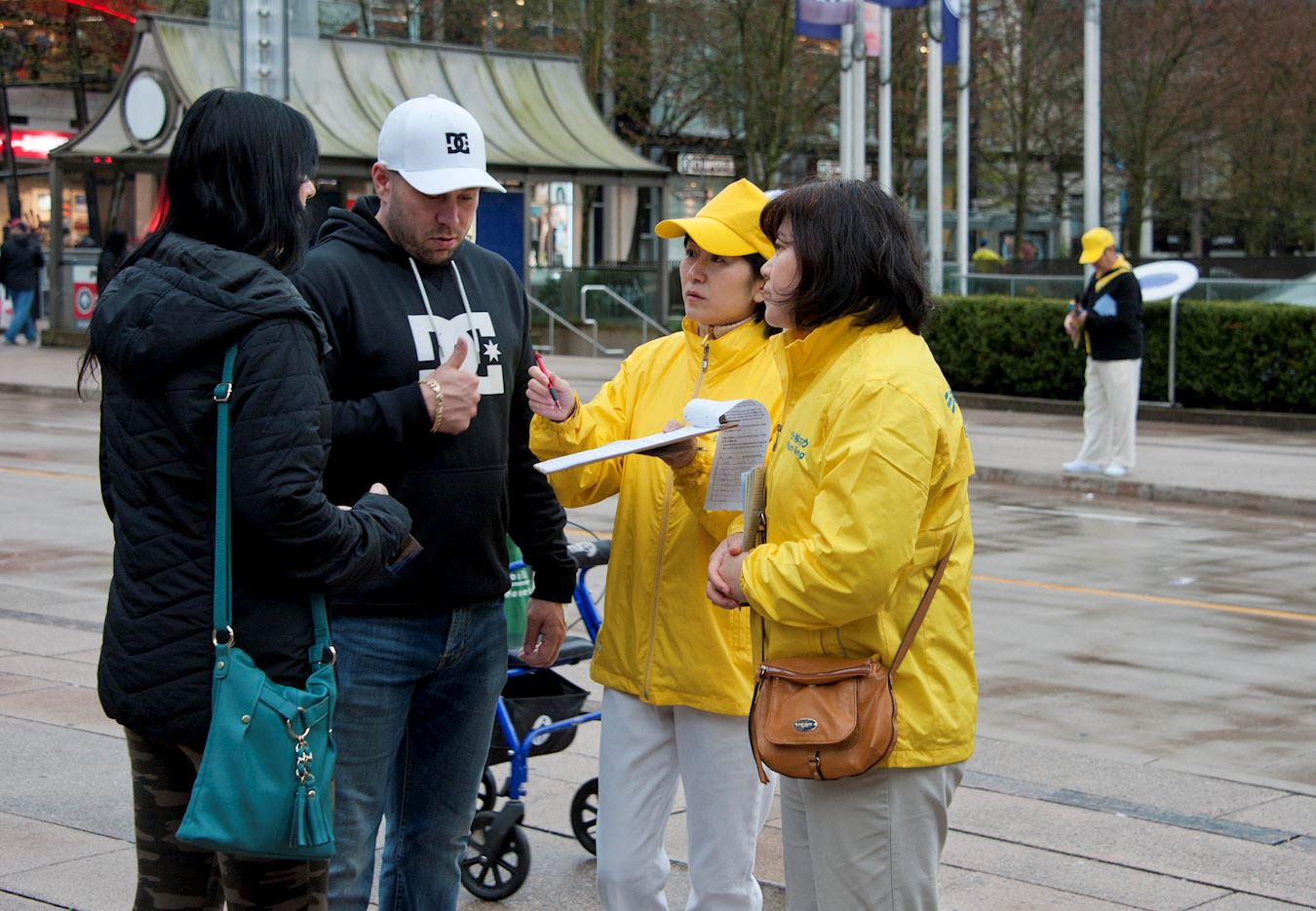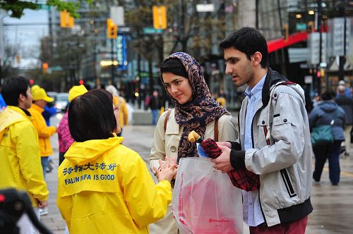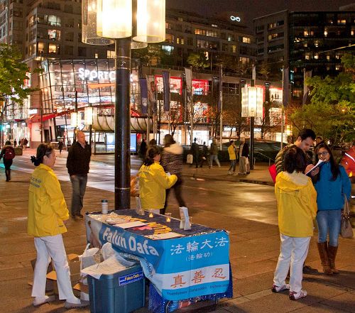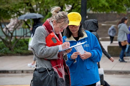 活动当天祥和的炼功场面吸引大批的温哥华市民停留观看,有市民双手合十向现场的法轮功学员致敬,有很多市民冒雨在现场停留,并签名支持法轮功学员的反迫害活动,还有很多市民拍摄活动场景。在晚上烛光守夜活动开始后,仍有很多市民在活动现场停留观看,并签名表示支持。