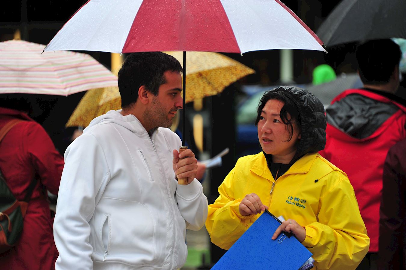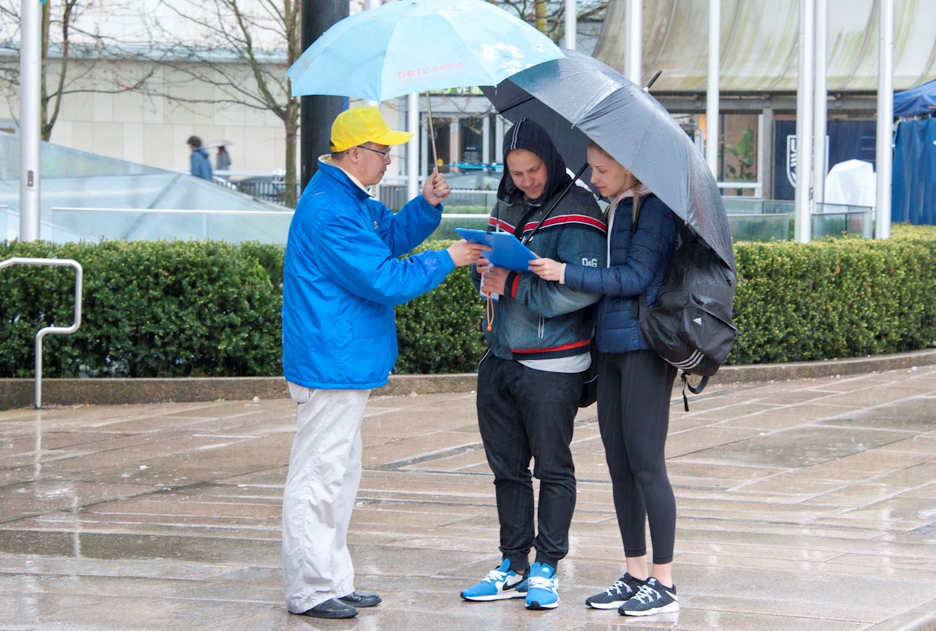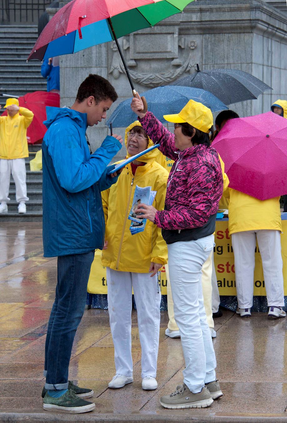![]() 图9~10:温哥华市民冒雨停留倾听法轮功真相 |