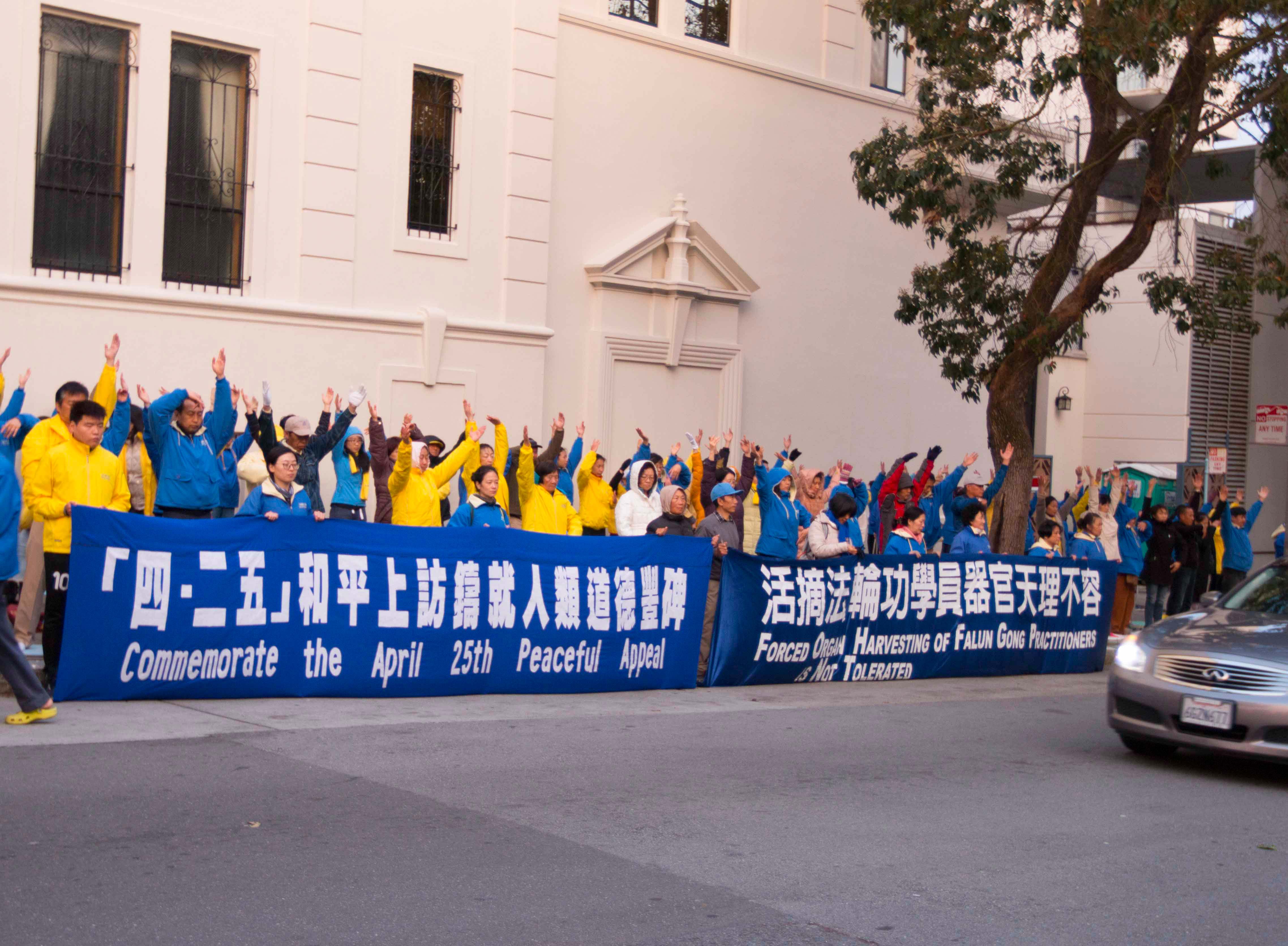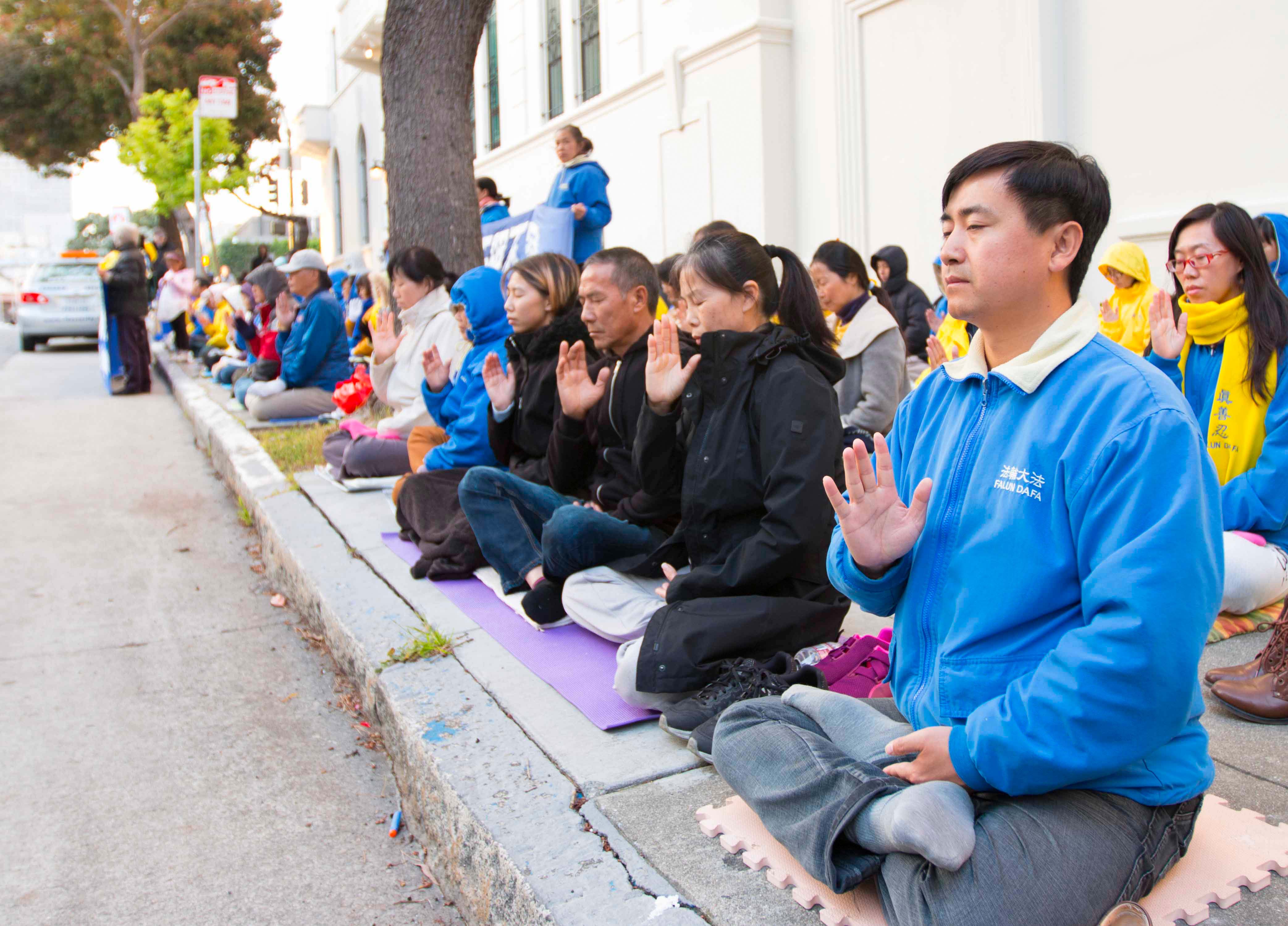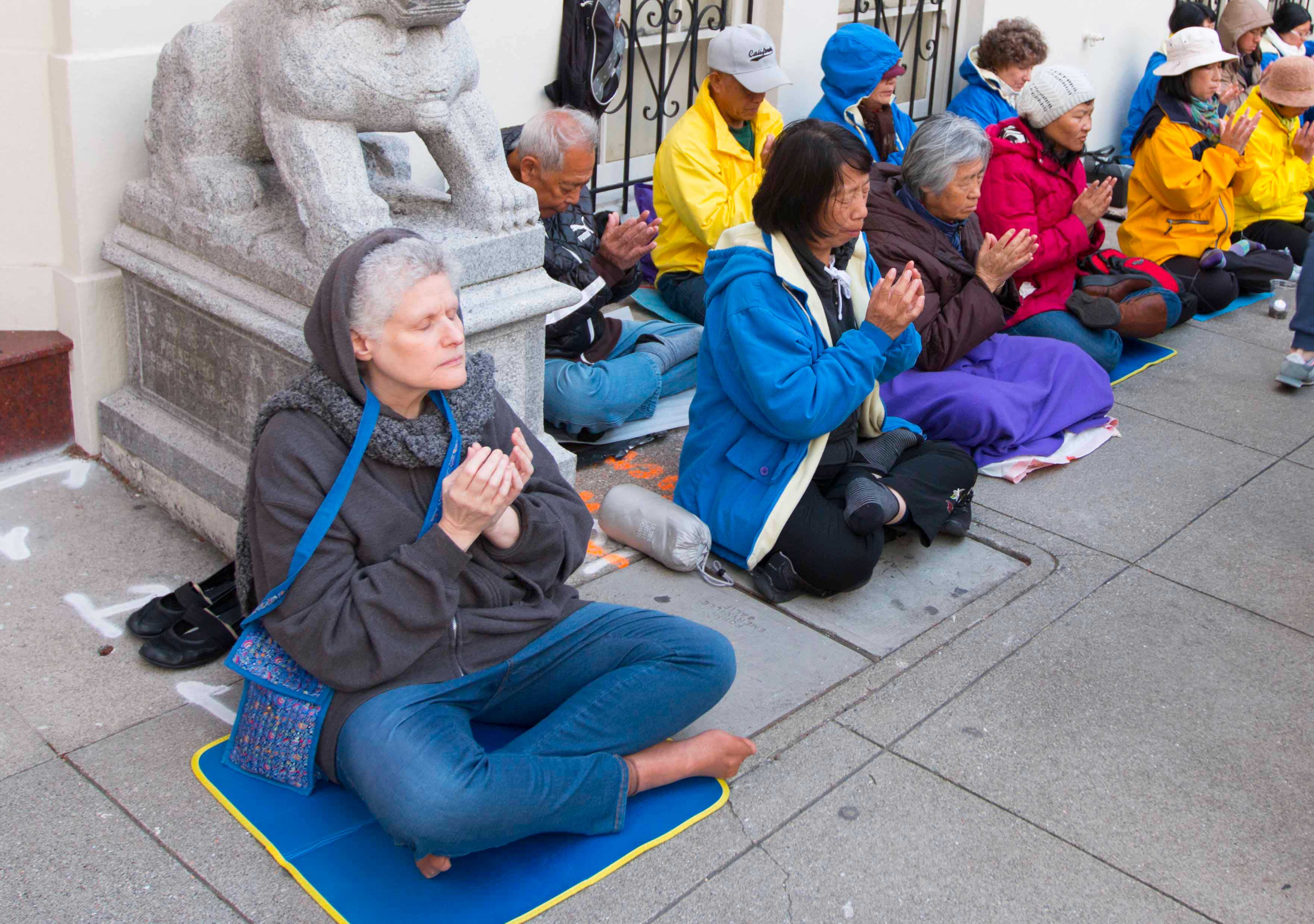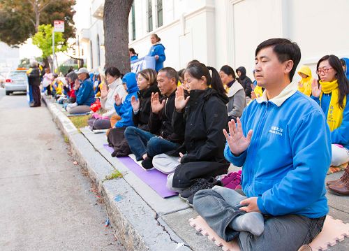 旧金山居民Iris Perla知道法轮大法的美好。她当天特地来中领馆与法轮功学员坐在一起。她说:“法轮功非常美好,我一直想来参加法轮功的活动。我在报纸上了解到中共对法轮功的迫害,中共甚至活摘法轮功学员的器官,这太恐怖了。今天我了解到法轮功学员要来请愿,因此我也要参与请愿。”