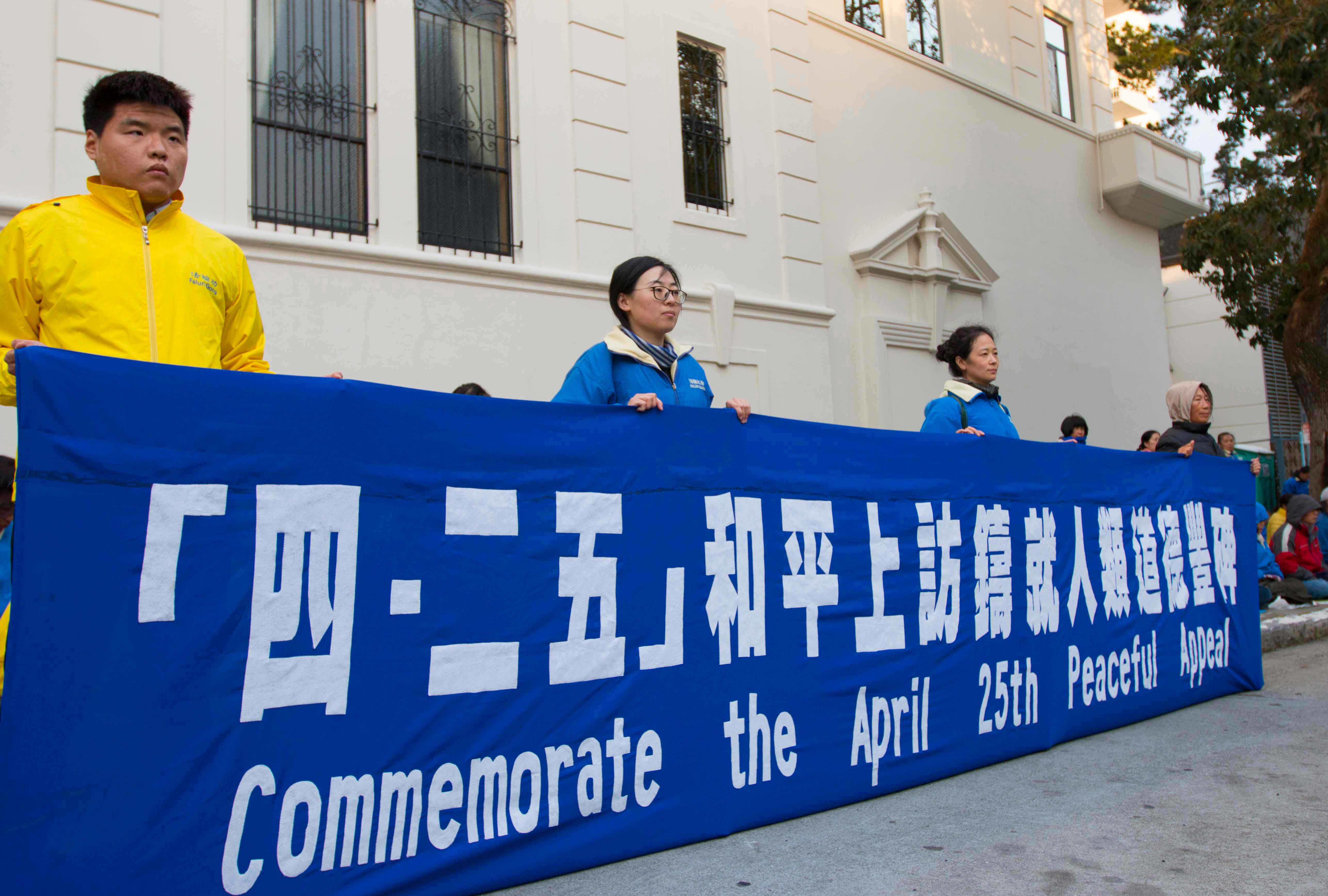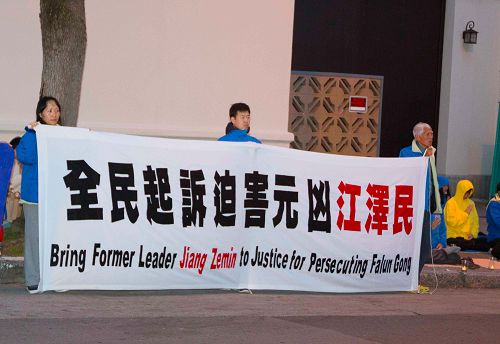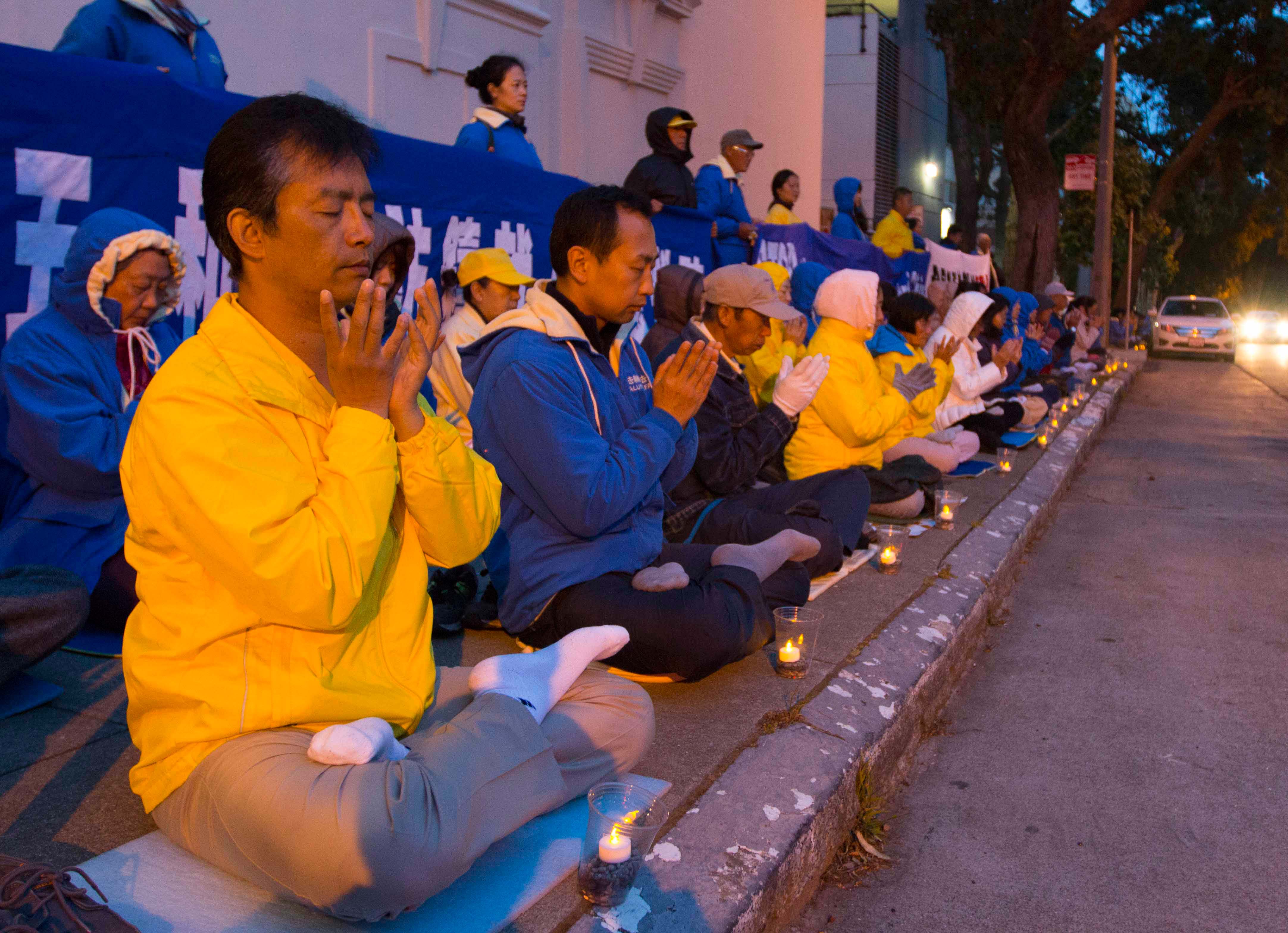 法轮功学员在中领馆前,手持“真、善、忍”、“四•二五和平上访铸就人类道德丰碑”、“解体中共 制止迫害”等中英文横幅,并点燃蜡烛,表达着他们对被迫害致死的同修们的缅怀之情。