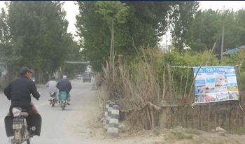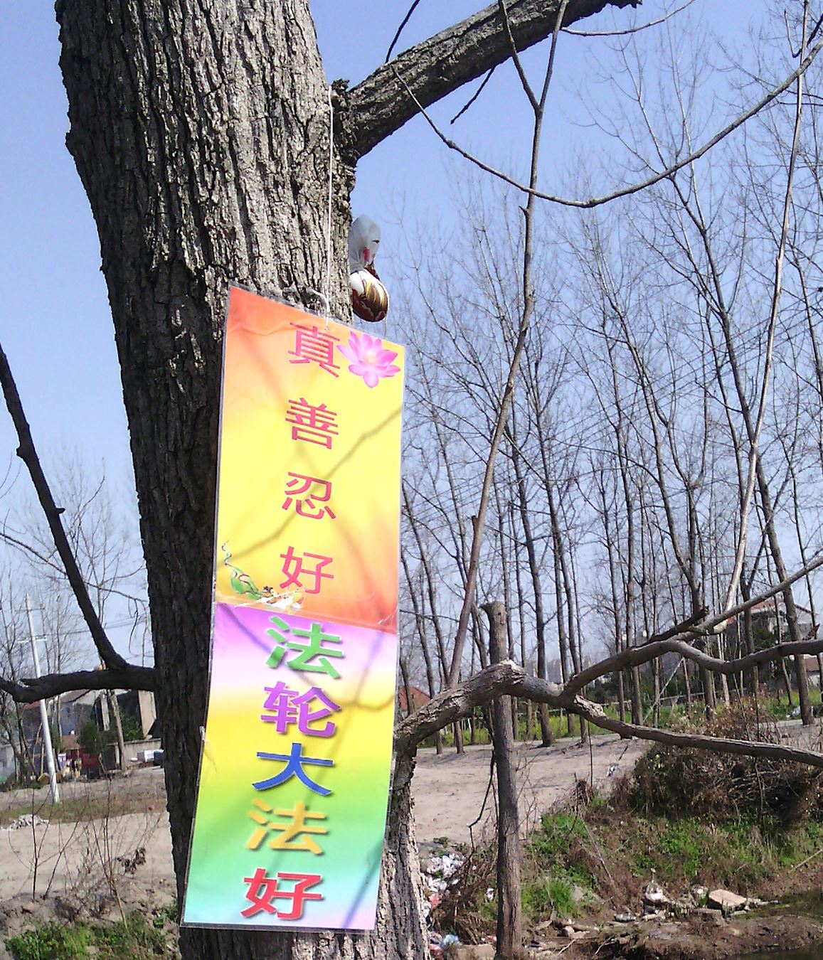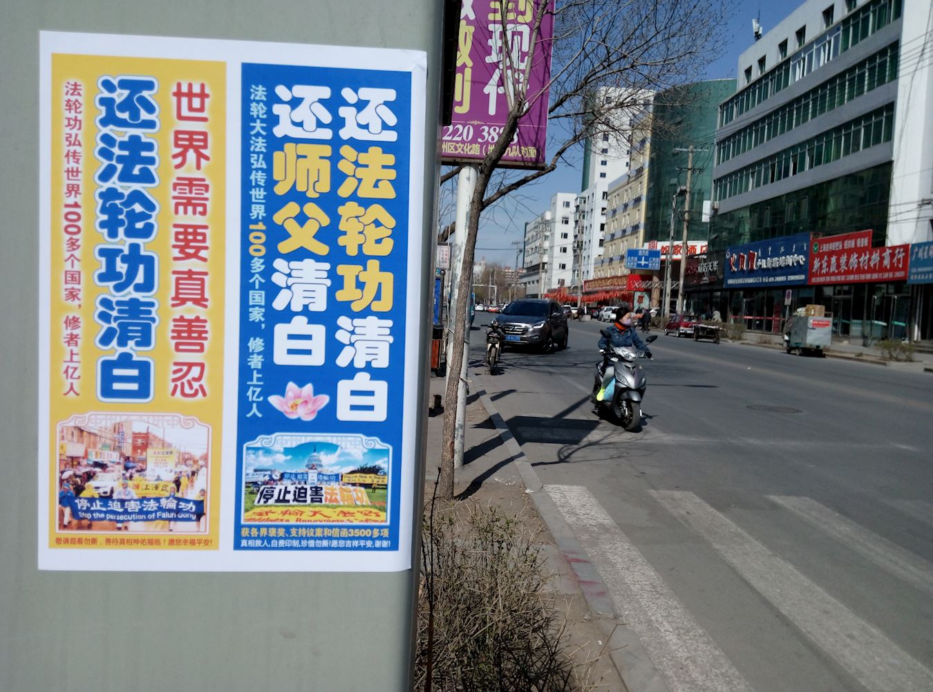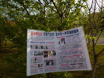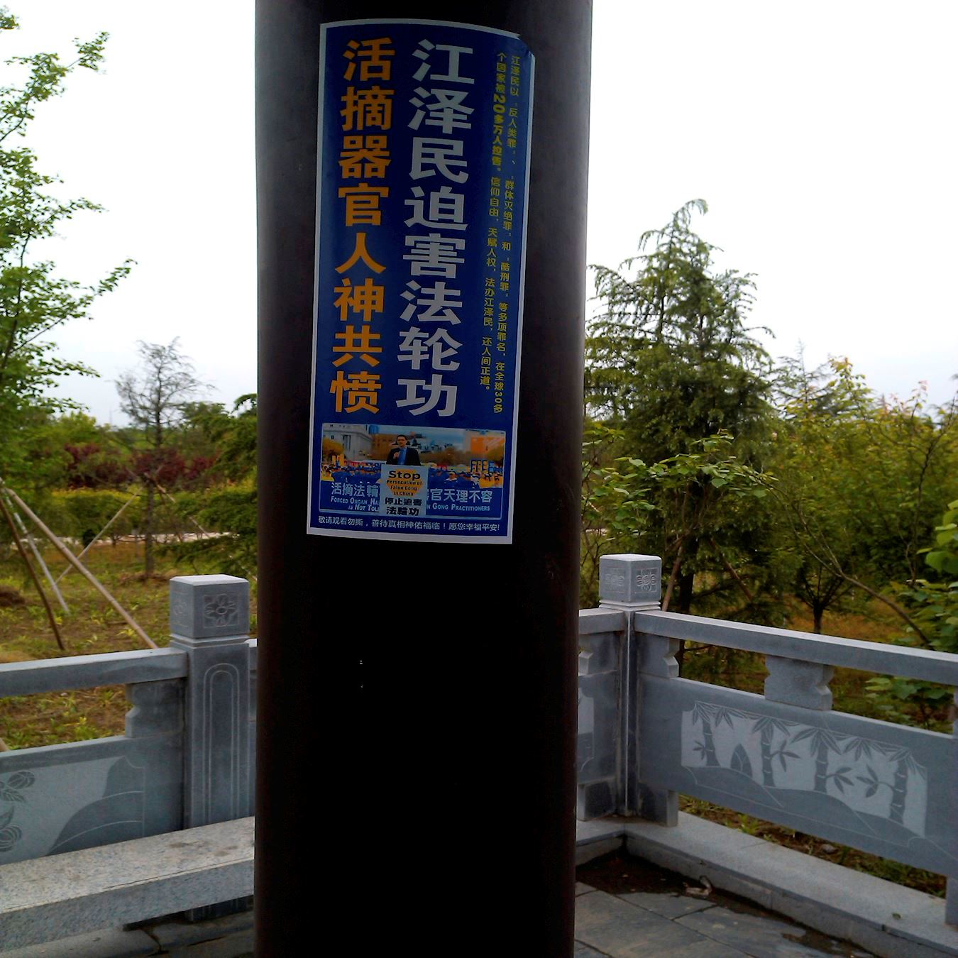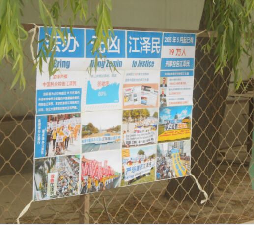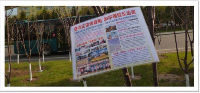 4.25期间吉林市法轮功学员向世人展现法轮功真相展板、树挂和粘贴
