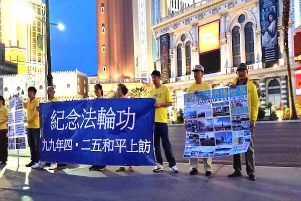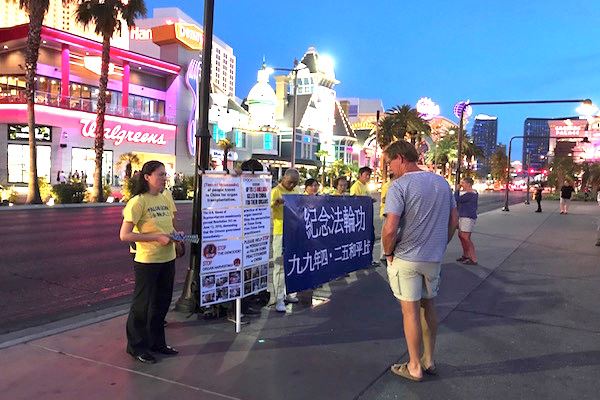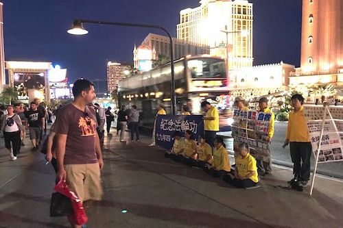 今年的四二五,是一九九九年四月二十五日上万名法轮功学员在北京国务院信访办和平上访十八周年的纪念日。四月二十三日傍晚,拉斯维加斯法轮功学员特地穿着印有“真、善、忍”中英文字样的黄颜色T恤,来到赌场大道Mirage酒店的真相点,向中外游客讲真相。
