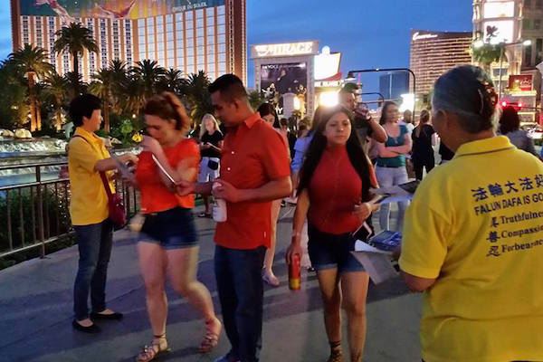中国游客来美国西部观光,拉斯维加斯是必到之处。赌场大道的“火山秀”景点是法轮功学员讲真相的地方,每星期法轮功学员都来这里摆真相展板,拉横幅,放真相广播,发报纸、讲真相劝三:退.等,帮助中国游客选择美好的未来。