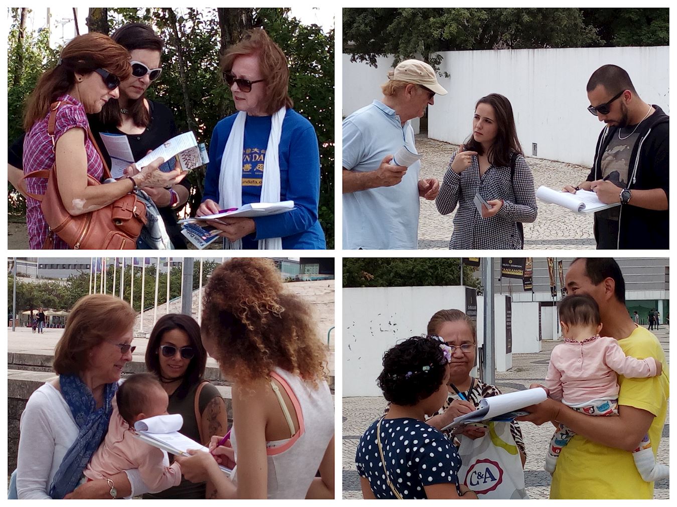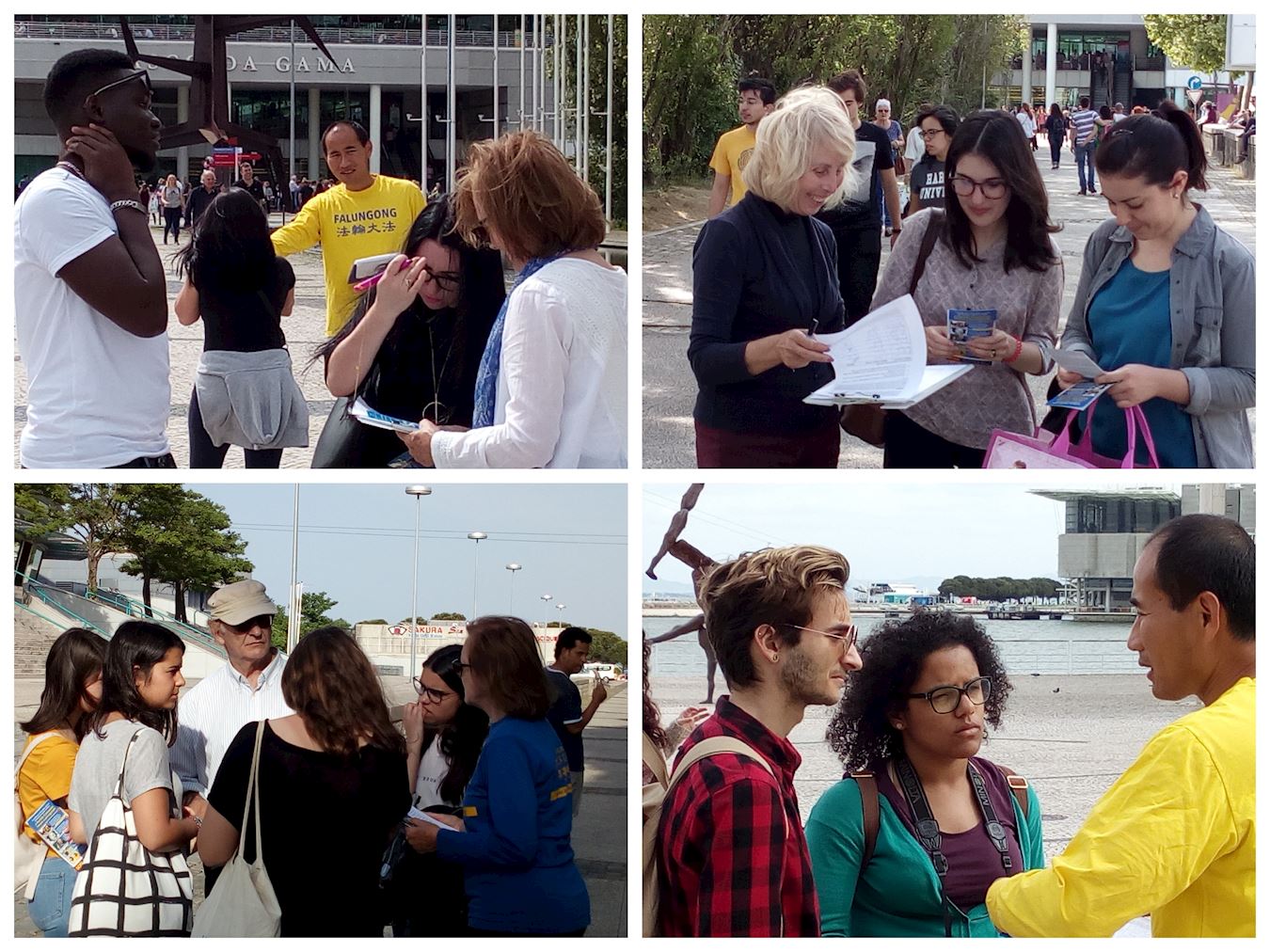 随着祥和的炼功音乐法轮功学员展示了功法,吸引了不少过往的民众驻足观看,一些从未听说过法轮功被迫害真相的葡萄牙民众停下脚步,详细地听法轮功学员讲述真相;有些已经了解到真相的人询问如何帮助法轮功去制止这场迫害。