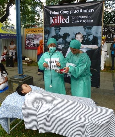 活动期间,学员们用情景模拟的方式揭露中共为迫使法轮功学员放弃对“真、善、忍”的信仰而对其施用的各种酷刑及活体摘取法轮功学员器官盗卖的惊天罪行。