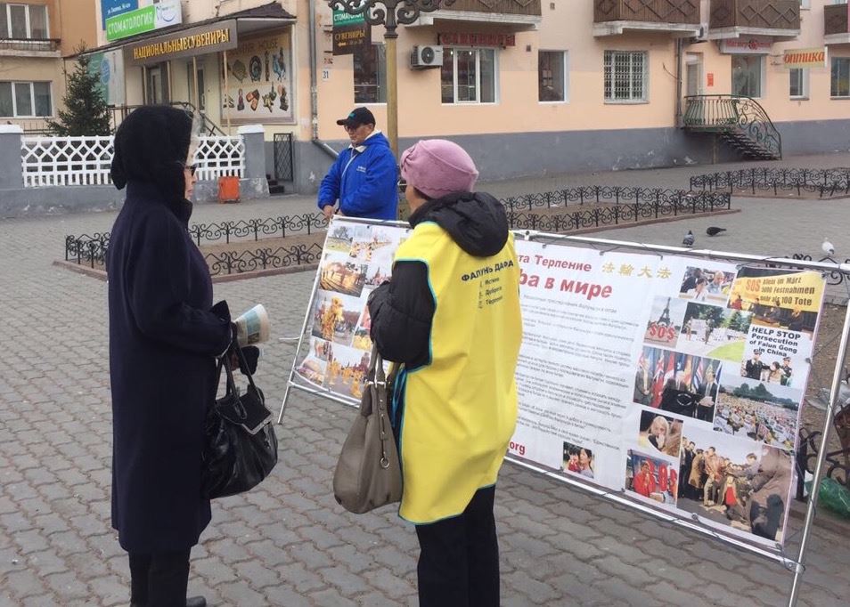 四月二十一日,法轮大法学员在乌兰乌德市中心大街举行了集会,虽然刮着冷风,但是过往行人仍然驻足宣传板前了解真相并且在停止迫害请愿书上都签了名。
