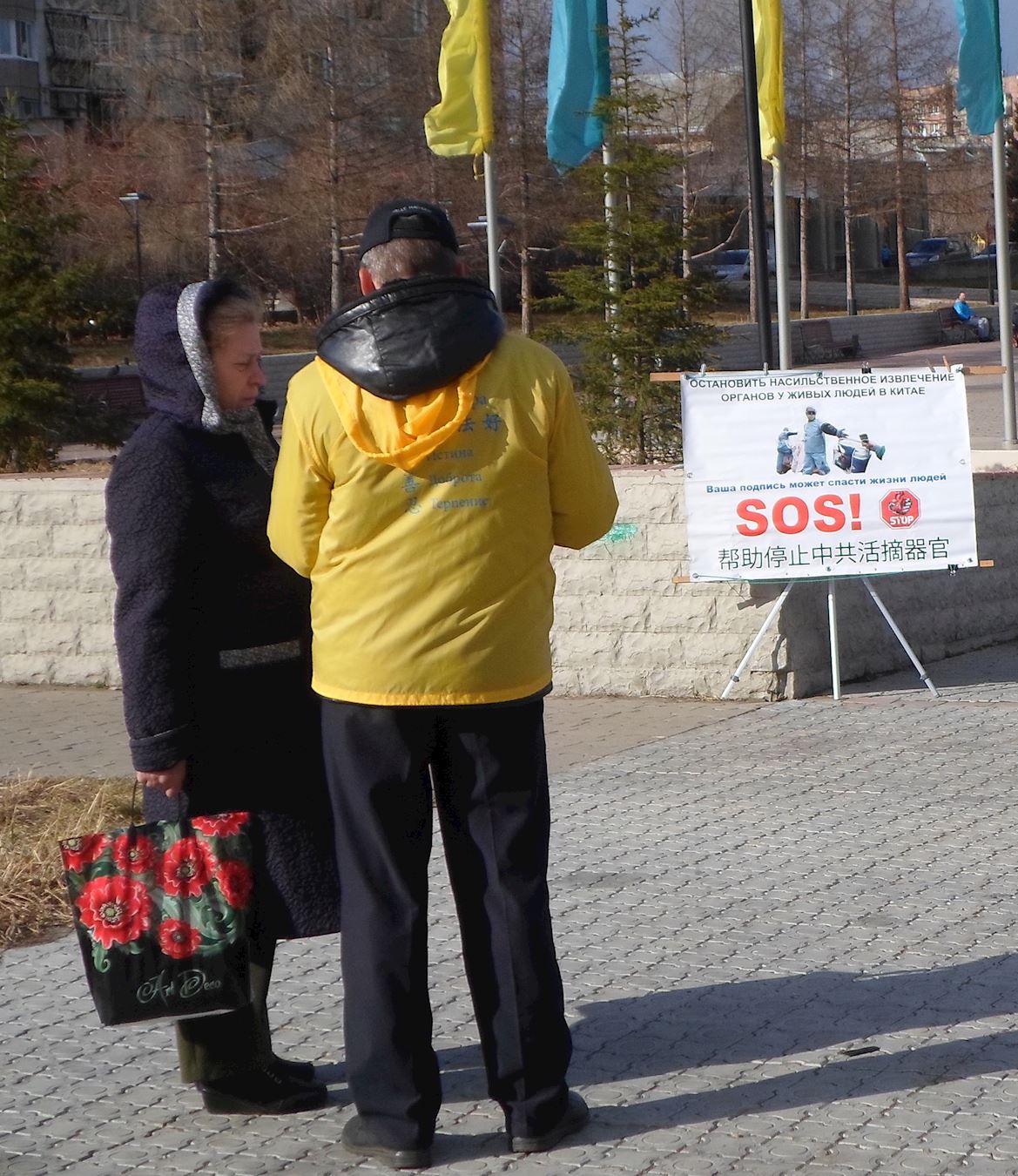 同一天,在托木斯克市中心距离百货商场不远的主干道路口法轮功学员举行了集会,现场发放了真相传单,为递交联合国请愿书征集签名,展示了法轮大法功法。路人以各种方式表达了对反对活摘器官征集签名的支持。所发生的一切对于大多数路人来说都是令人震惊的新闻,一些人对于举行集会的学员表达了感谢。