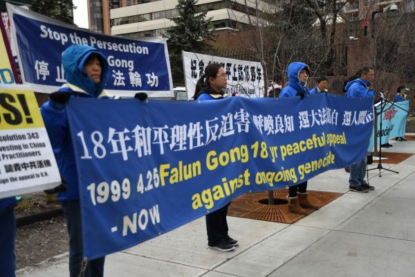 ![]() 图1~2:卡尔加里法轮功学员在中领馆前集会,纪念“四二五”和平抗争十八周年。 |