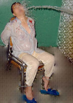 在屋角处两面墙上各有一吊环,将我立于墙角,双臂抻开双手分别吊铐,双腿被脏布条捆绑,眼睛被脏布条蒙住,再用电卡子在两手的小手指根处卡住。开始摇电表,我透过脏布看到身体冒蓝光,身体被电击刺激胀痛难耐,电闸一开一合,同时我被电刑逼供,看我不说,便拽我脖领子往身体里倒水,凉水顺着衣领一直流到脚底。又是一开一合电击。