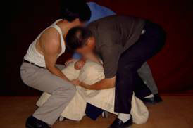 两天后,他们把我拖回刑警大队,让我坐在铁椅子上,在我身体极度衰弱的情况下,身体双腿双脚五花大绑,在我两个拇指上套上铜铁片圈,用螺丝拧紧,铜圈连着电线,再推上电闸:我衰弱的耷拉着头,且绑紧的身体在电流冲击下,像火苗子一样往上蹿。停下电后,他们对照早已写好的所谓发了多少光盘、传单的黑材料:“不够一百不够判,得给她整够数,好判她。”写完了,就将奄奄一息的我的手抓过来按手印。之后,将我送至看守所。