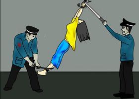 晚上九点多他们把我带到酷刑房,把我吊到棚顶的铁管子上,其间不吃、不喝、不让上厕所,他们拽绳子,不断的将我拽上来、抛下去,不断的悠我的身体,直到第二天上午十点多,才将我放下。当卸下刑具时,我的双臂已无知觉,仍保留吊挂姿势,双臂放不下来了,他们硬是将我的手臂掰了下来。我的双臂、双手肿大变形、呈紫黑色、无任何知觉,不能自理。