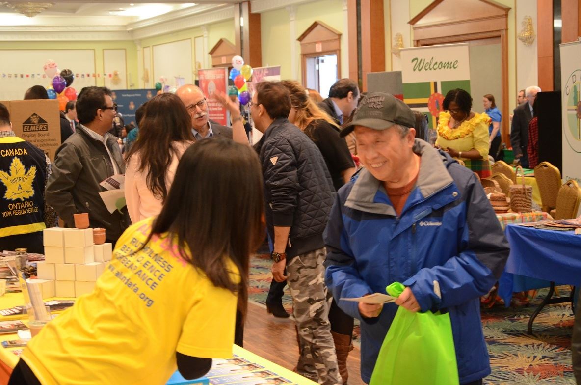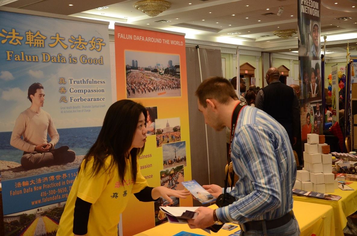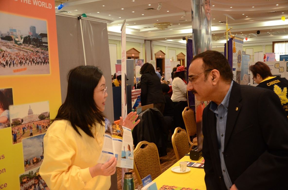 前来参加活动的马先生刚刚来到加拿大留学,他看到法轮功的展位时很吃惊,但还是和法轮功学员攀谈起来,他告诉学员他今天看到的法轮功和在大陆被告诉的不一样,他不相信大陆对法轮功的抹黑宣传。学员告诉他法轮功的书籍已经翻译成三十多种语言在世界各地发行,还在一百多个国家和地区弘传。在二十多分钟的交谈后,马先生表示他很高兴今天了解到了这样多的讯息。