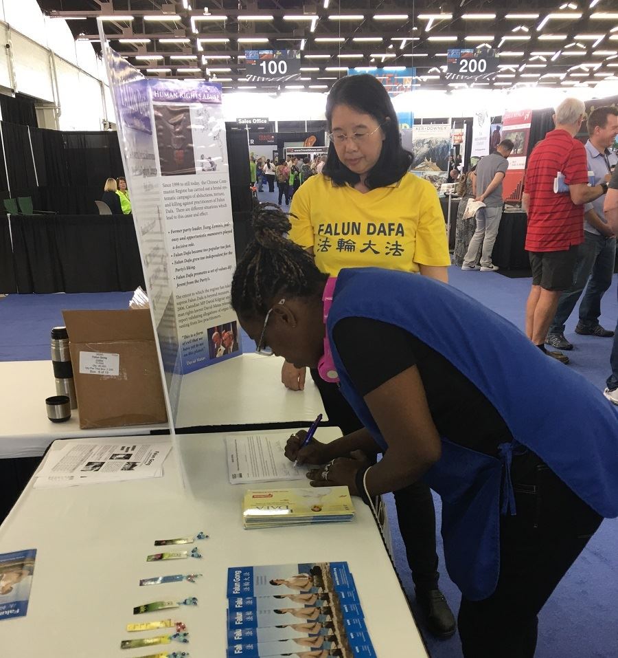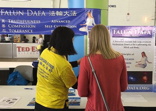 Irving市的会计师Lisa女士经过法轮功展位时,对功法产生了浓厚的兴趣,拿到达福地区各个炼功点的联系信息后她非常兴奋,听到中共活摘器官这样可怕的事情,她很惊讶,立即在反迫害征签簿上签了名,并把她的朋友叫过来,把自己刚才听到的真相讲给朋友。