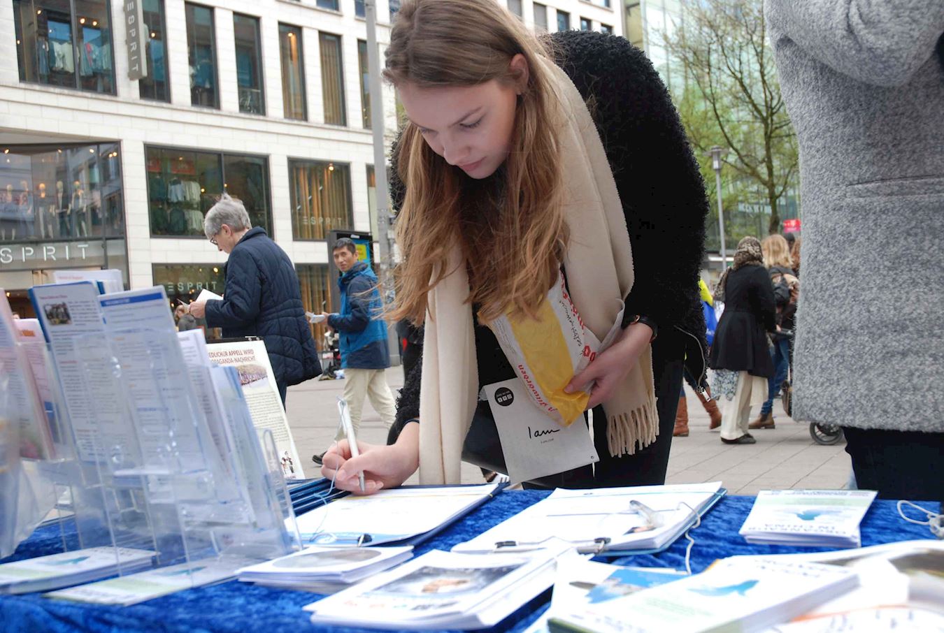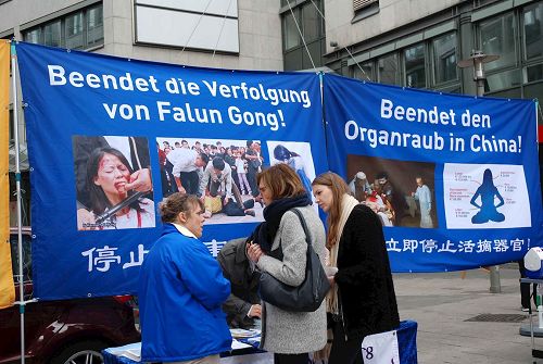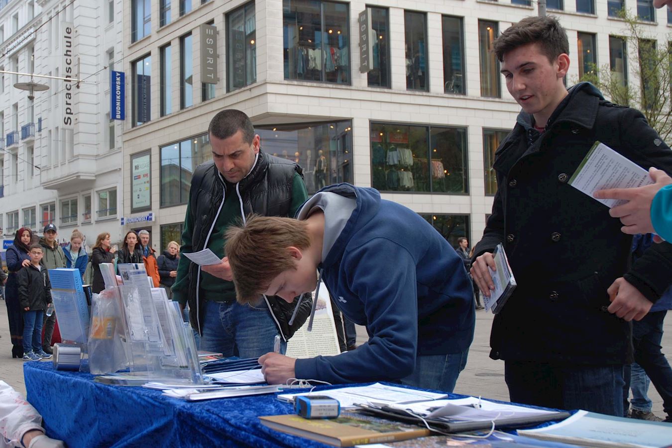 一个四十五岁左右的德国女性走到展位前,告诉法轮功学员:“你们做这件事(讲真相)真是太好了。”她说她自己也是为了讲真话绝不退缩的人:“我们早晚都要离开人世,所以还是说真话吧,没有什么可以害怕的。”当她得知法轮功学员即使在被酷刑折磨的情况下,还是对警察劝善,告诉他们法轮大法真相的时候,她的泪水夺眶而出,说,“我真的发自内心的希望他们(中共)住手。这一切必须马上被制止。”她在制止活摘器官的征签表上签字后,和法轮功学员握别。