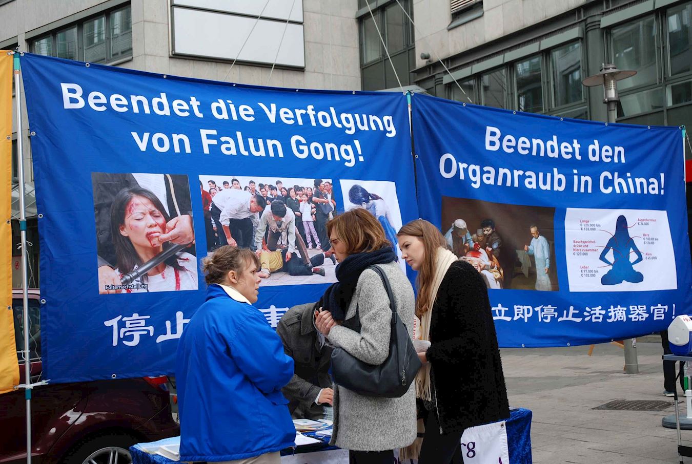 Irina是个三十出头,看上去非常知性的年轻女子。她在一年前已经在汉堡的Abaton影院看过有关中国活摘异见人士器官牟取暴利的影片,今天她和同伴路过,看到巨大的制止活摘的横幅,二话不说就签名反对中共暴行。