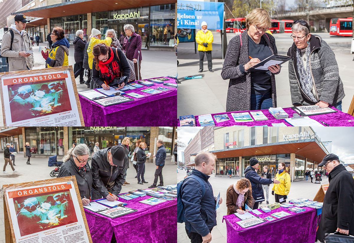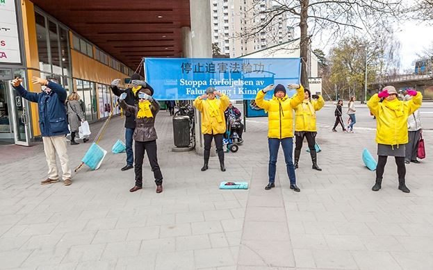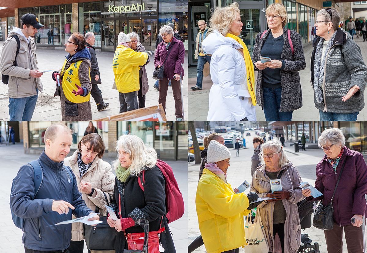 法轮功学员的真相信息台就设在法尔斯塔地铁站前、本地区购物中心出入口处,这里来来往往的人川流不息。优美的炼功音乐吸引了很多人驻足观看,前来了解法轮功真相的民众络绎不绝。他们有的在用手机拍照、有的仔细阅读真相展板,有的主动和学员交谈了解详情。