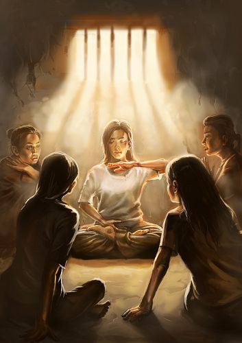 作品展现被非法关押在狱中的大法弟子在炼法轮功的第五套功法“神通加持法”,祥和的场感染同监室的人。