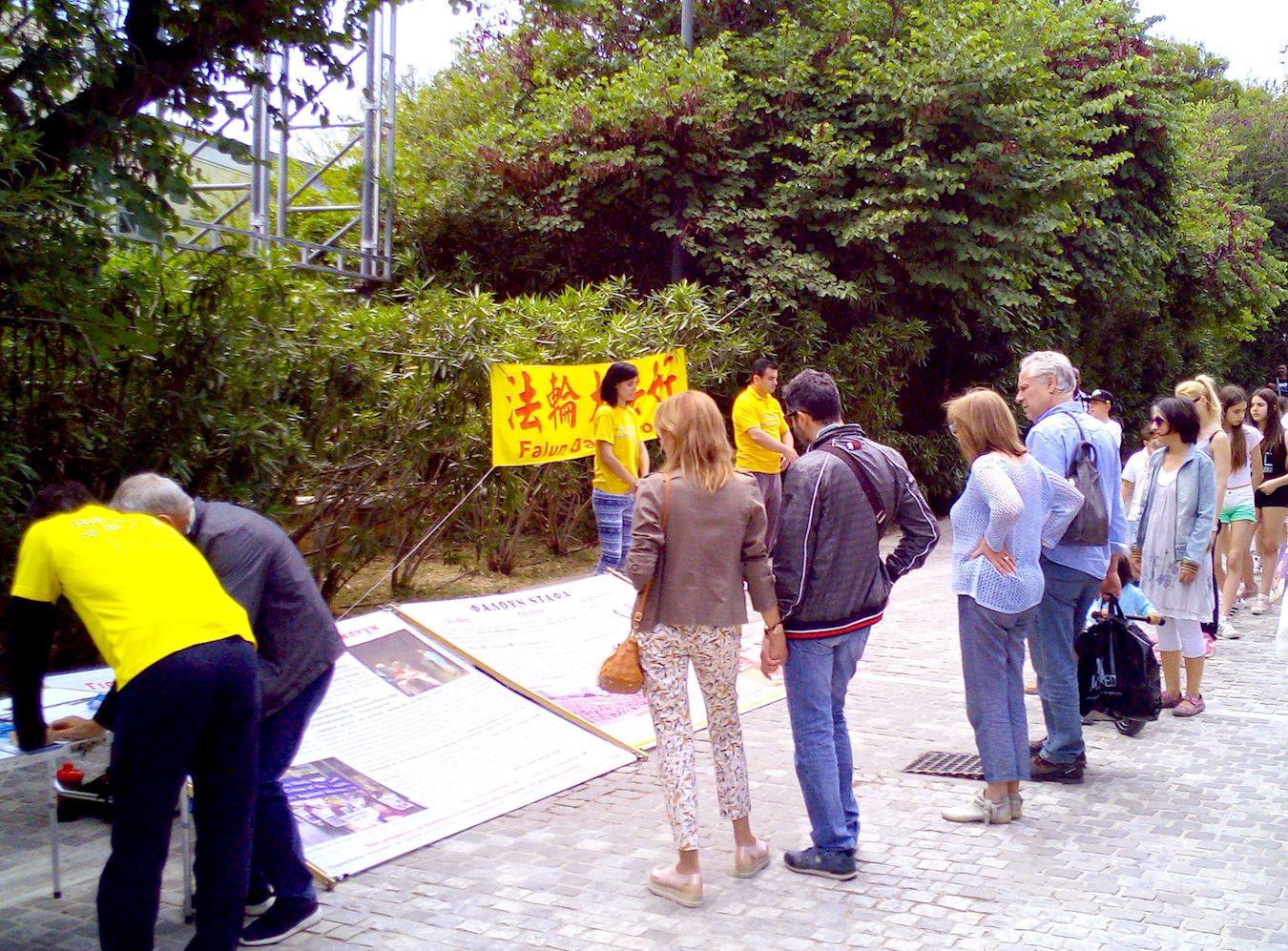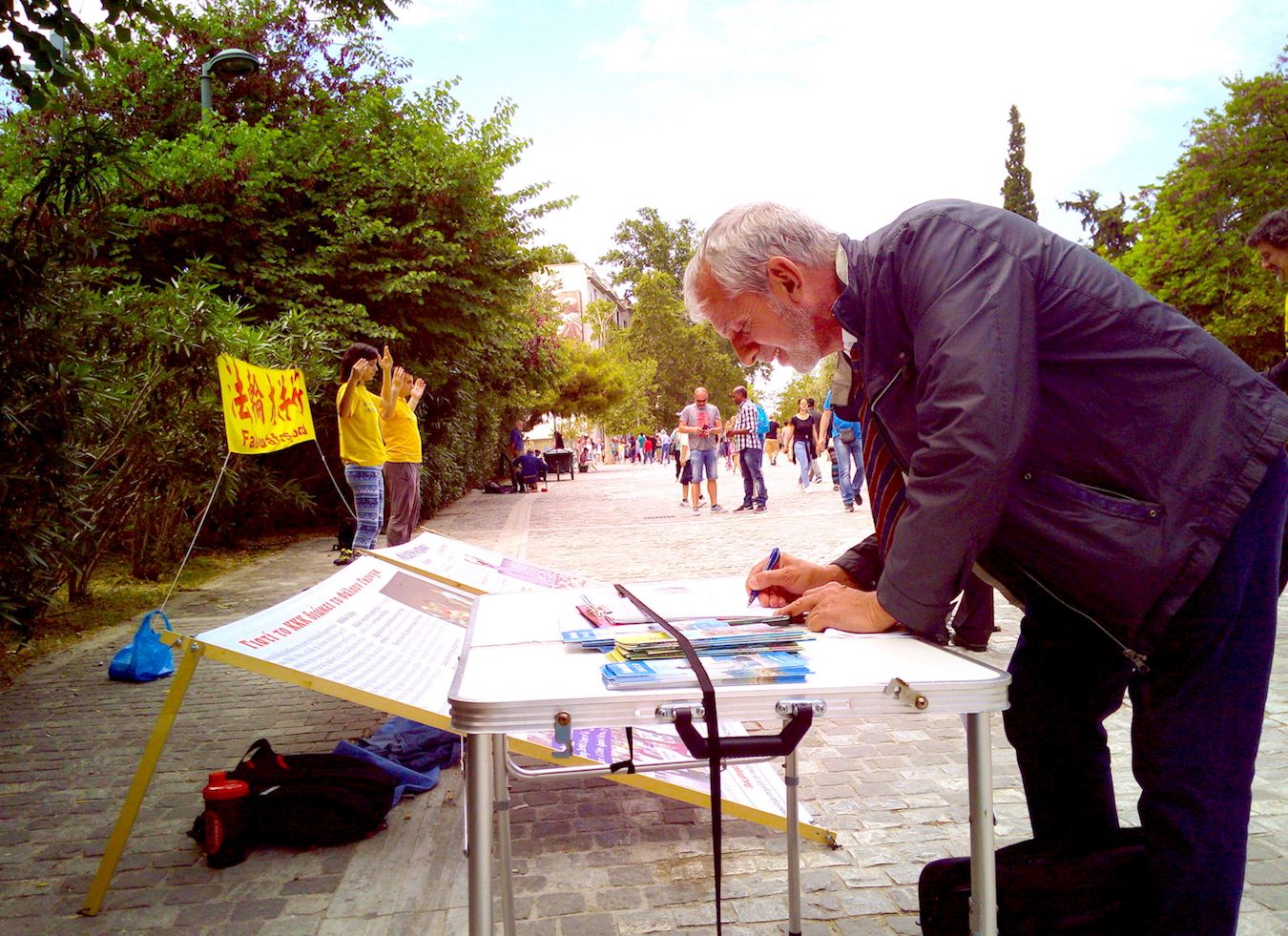 路过的游人纷纷前来观看学员们炼功,更多的游人则是在观看展板了解真相。一位绅士主动跟学员要了张真相单,了解真相后,在请愿书上签名支持法轮功学员。他对学员讲,很高兴能在这里看到你们,在哪里能够找到你们的炼功点?表示要来学炼法轮功,经过学员的详细介绍后,才欣慰地离开。