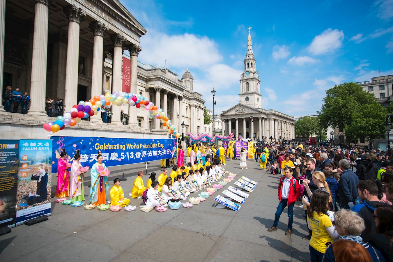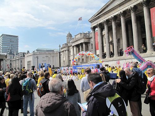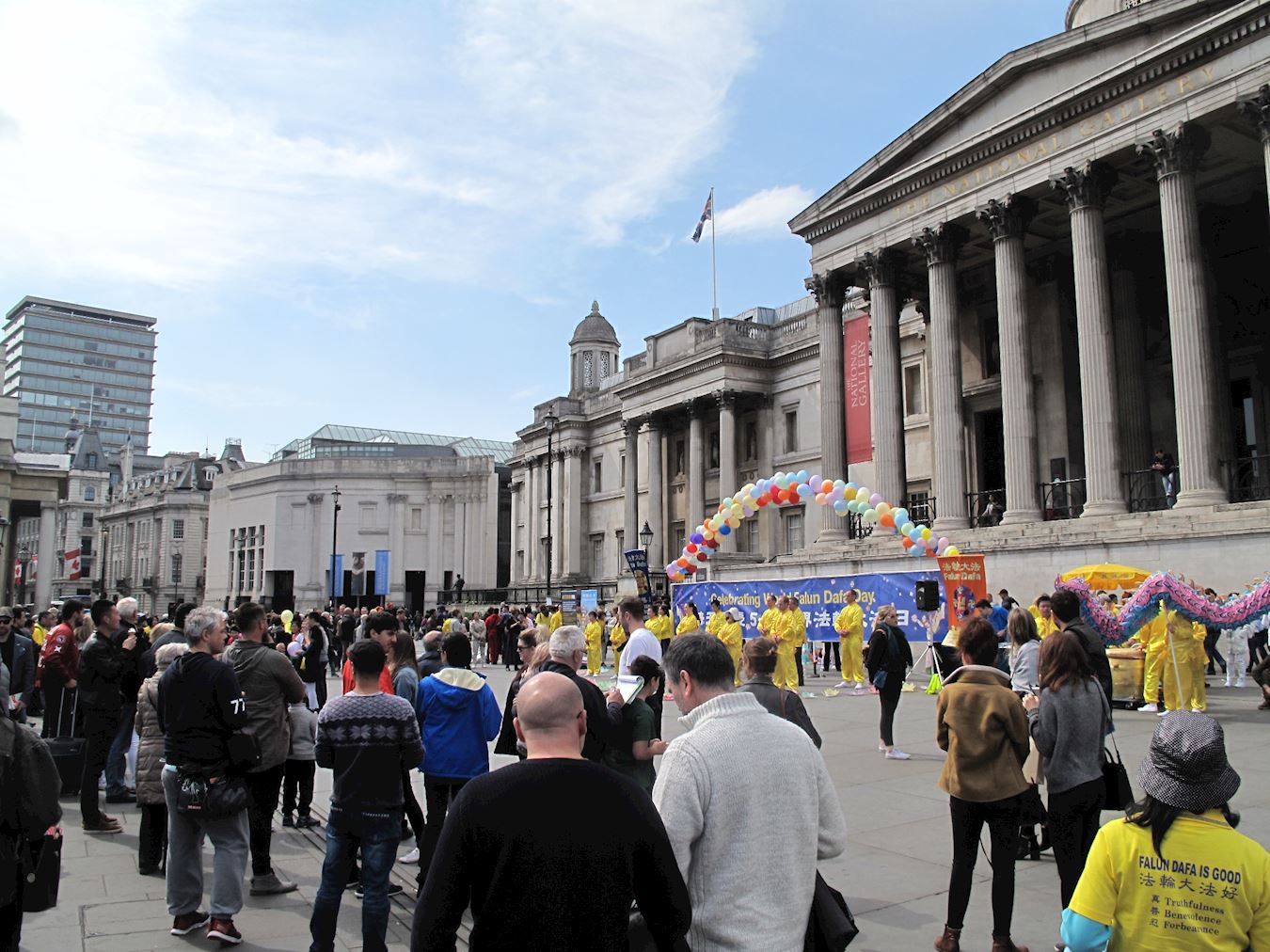 五月七日上午,法轮功学员在伦敦中使馆对面举行了集会和新闻发布会,然后,从伦敦中使馆前出发举行游行。游行队伍途经伦敦中心繁华的商业街区和伦敦唐人街。下午两点,游行队伍来到特拉法加广场北面平台,在那里举行了新闻发布会和庆祝活动,并向民众传播真相。新闻发布会后,学员们拍照、录像,恭贺李洪志师父华诞!感恩师尊,感恩大法带来的身心巨变!