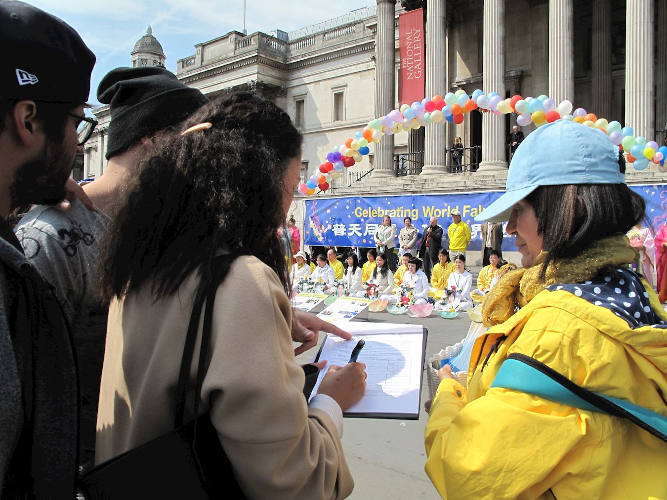 ![]() 图1~3:二零一七年五月七日,英国法轮功学员在伦敦特拉法加广场北面平台举行“庆祝世界法轮大法日”活动 |